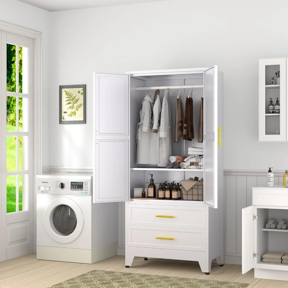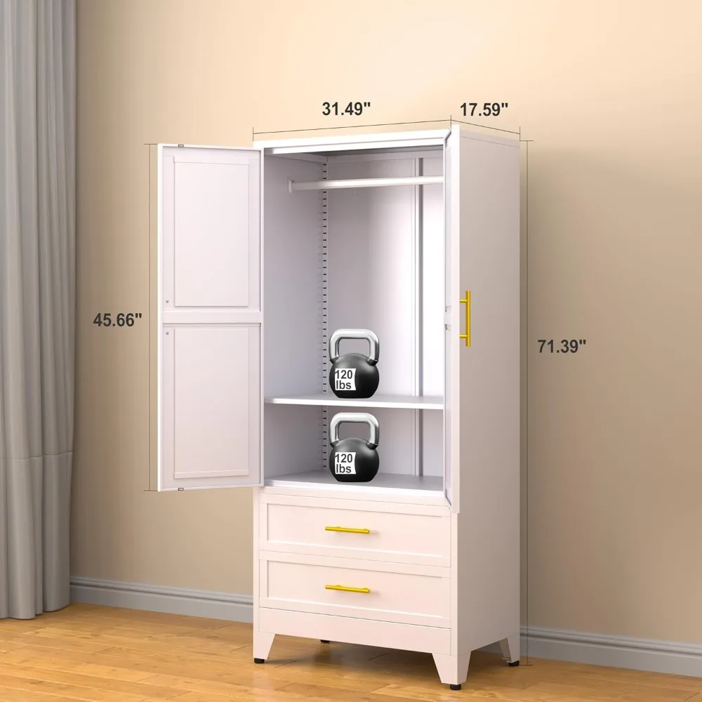 【Exceptional Storage Space】Standing at 70.87"H × 17.71"W × 31.5"D, this bedroom armoires is meticulously designed to maximize every inch of space. Crafted to accommodate a vast array of items, this multifunctional armoire closet features dedicated sections for hanging, shelving, and drawers, providing unparalleled flexibility for all your storage needs. 【Versatile Organization】Our wardrobe closet with drawers comes equipped with a sturdy hanging rod, perfect for longer garments like dresses, suits, and pants. The adjustable shelves allow you to customize the storage area, making room for bulkier items, while the two spacious drawers offer a discreet space for smaller essentials such as underwear, socks, or toys. 【Superior Build & Safety】Each door of the tall wardrobe closet is secured with dual strong magnets, ensuring a tight seal every time. The 4 adjustable feet keep the wardrobe stable, even on uneven surfaces. For added safety, we've included an anti-tip design with pre-drilled holes at the back, allowing you to anchor the armoir to the wall, safeguarding against accidents. 【Premium Quality Materials】Constructed from thickened cold-rolled steel plates, this wardrobe cabinet is built to last. Each shelf is designed to hold up to 120 lbs, offering robust support for your belongings. Finished with electrostatic powder spraying technology, the cabinet is not only resistant to scratches and wear but also incredibly easy to clean, surpassing the durability of traditional wood wardrobe closet. 【Effortless Assembly & Support】Assembling your new metal wardrobe armoire is a breeze, thanks to our detailed installation manual and video guide. Every part is clearly labeled and organized, ensuring a quick and hassle-free setup. And should you need any help, our dedicated customer service team is just a call away, ready to assist you every step of the way.