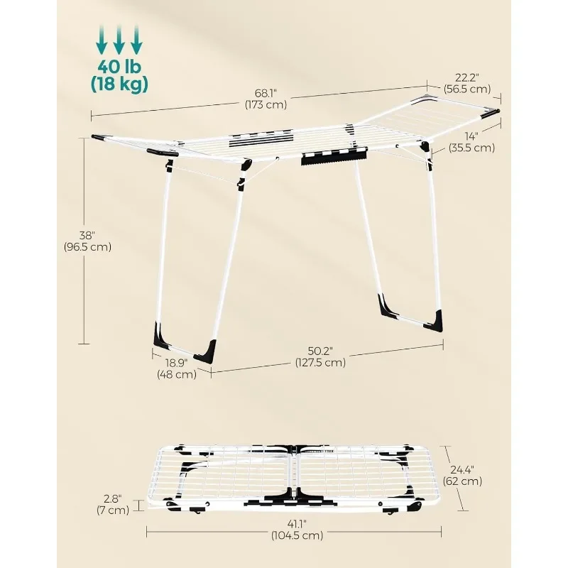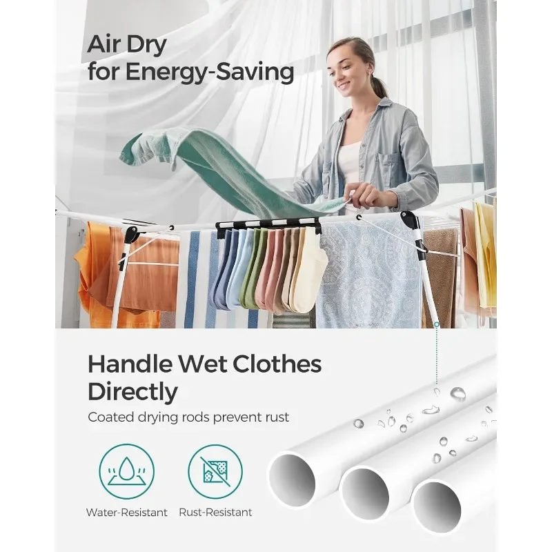 [Foldable and Rust-Resistant Design] If needed, the clothes drying rack can be folded and stored to save space. The drying rods are finished with a rust-resistant coating providing an extra sense of security when hanging wet clothes