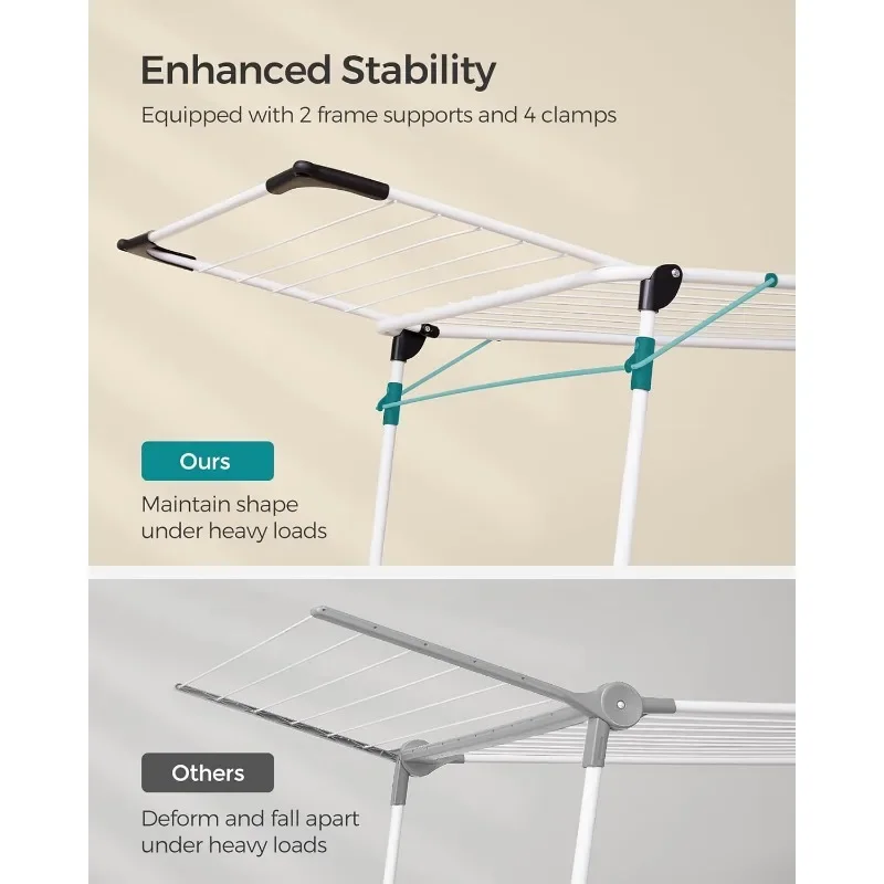 [Enhanced Stability] Reinforced structural design with 2 sturdy frame supports and 4 clamps provides stability. The clothes drying rack will not wobble, even with many items hanging on it