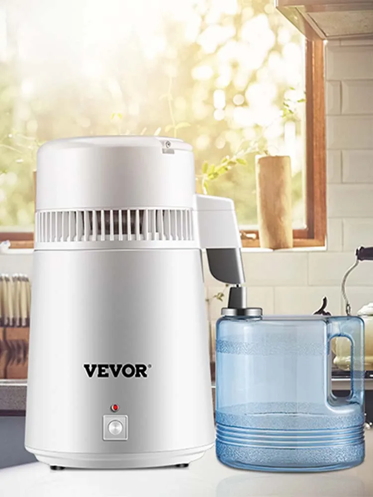 【User-friendly Details】: The upgraded home water distiller machine has a unique portable handle on the top, easy to carry. The water container has a large opening and an ergonomic handle for easy access and cleaning. We also provide free carbon packs and fruit acid cleaners without your additional purchase.