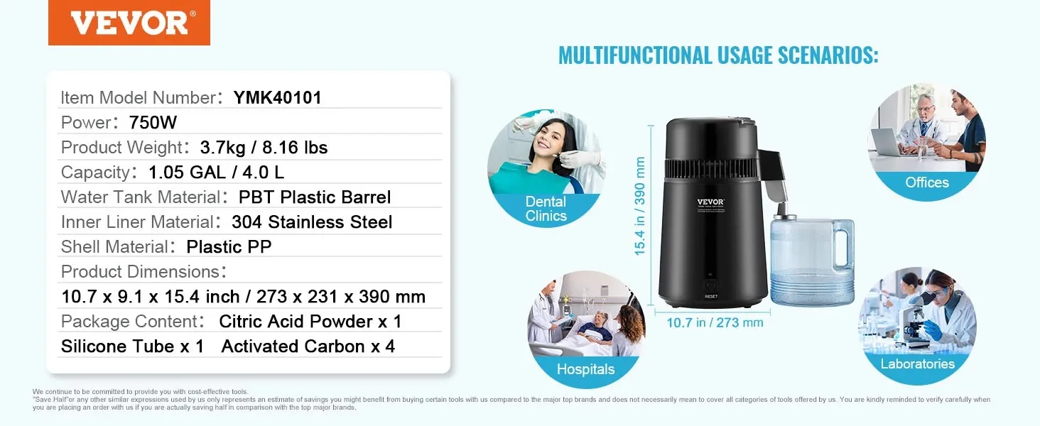【Efficient Water Purification】: Power level: 750W; volume: 4L/1.1 gallon. This water distiller can distill 6 gal/22.7 L per day to remove dissolved solids, VOCs, and almost all other impurities, offering you the purest water. Ideal for distilling water, alcohol, and so on. Perfect for offices, homes, labs, dental clinics, etc.