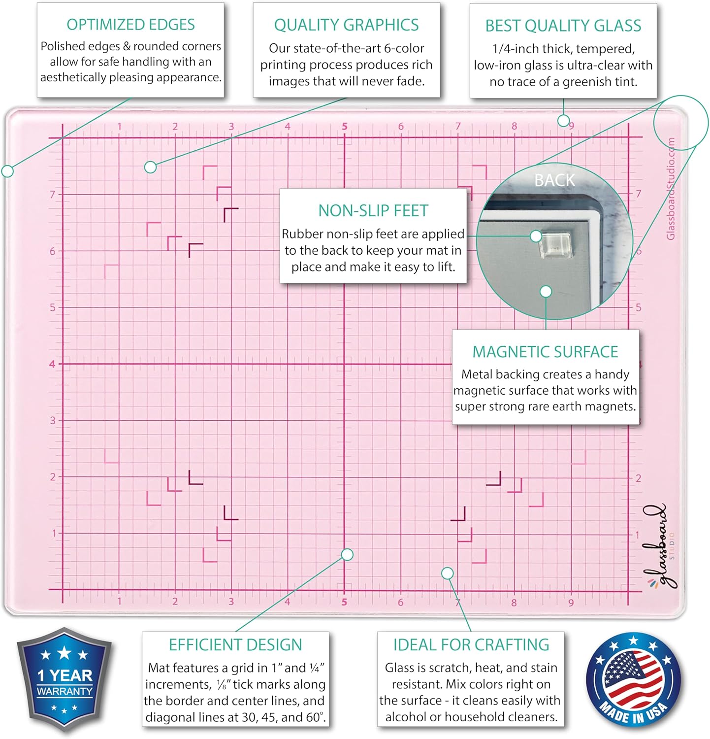 Introducing the GLASSBOARD STUDIO Glass Craft Mat – the ultimate cutting mat for crafts that every artist and crafter needs! Made from high-quality glass, this craft mat is designed to withstand heat, scratches, and stains, making it the perfect surface for all your mixed media artwork. With its magnetic metal backing, you can securely use rare earth magnets (please see our selection of neodymium magnets specifically made for glass craft mats) to hold your projects in place, while the non-slip rubber feet ensure stability on any surface.