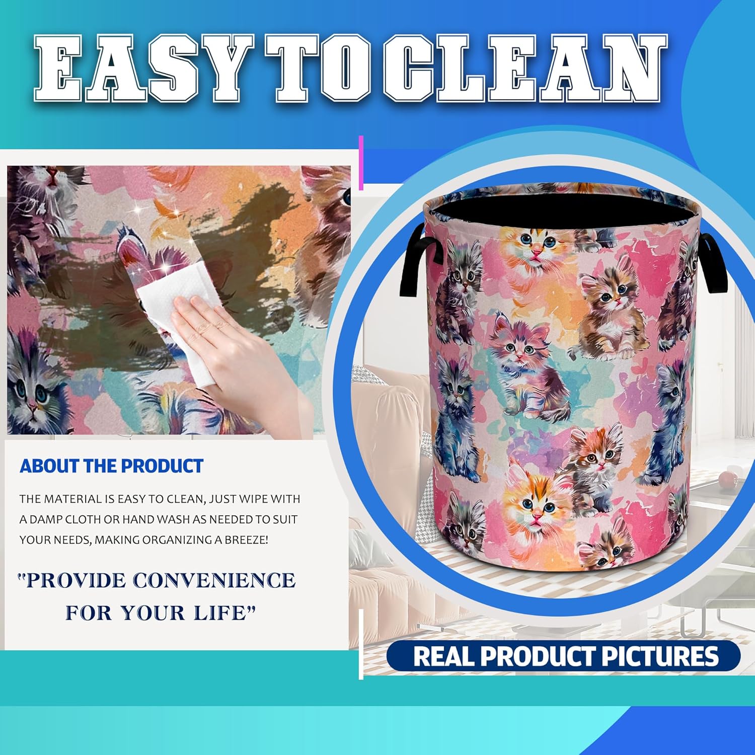 OXFORD CLOTH FABRIC: Lined, lightweight and portable, the material easy to clean, just wipe with a damp cloth or hand wash as needed.COMFORTABLE REINFORCED HANDLE: easy to grip, easy to carry, and more durable.LARGE CAPACITY: size 18.9 inches/48 cm (height) x 16.5 inches/41 cm (diameter). There is enough space to store a lot of clothes and store various items. Add a touch of art and functionality to your home with our eye-catching laundry basket!FOLDABLE: When not in use, our laundry basket can be folded to save space and easy to store, perfect for people with busy lives.WHY CHOOSE OUR LAUNDRY BASKET?Our Laundry Basket Is More Than Just A Storage Solution. It Is A Stylish Piece That Combines Artistic Beauty With Daily Practicality. Make Organization A Breeze!MULTI-PURPOSE BASKET: In addition to laundry, it is also very suitable for storing toys, books, blankets or other items. It has a wide range of uses, keeping your living environment clean, beautiful and tidy. It is a multi-functional product. The artistic design laundry basket is a good choice for bathrooms, bedrooms, laundry rooms, children's rooms, dormitories and other places.