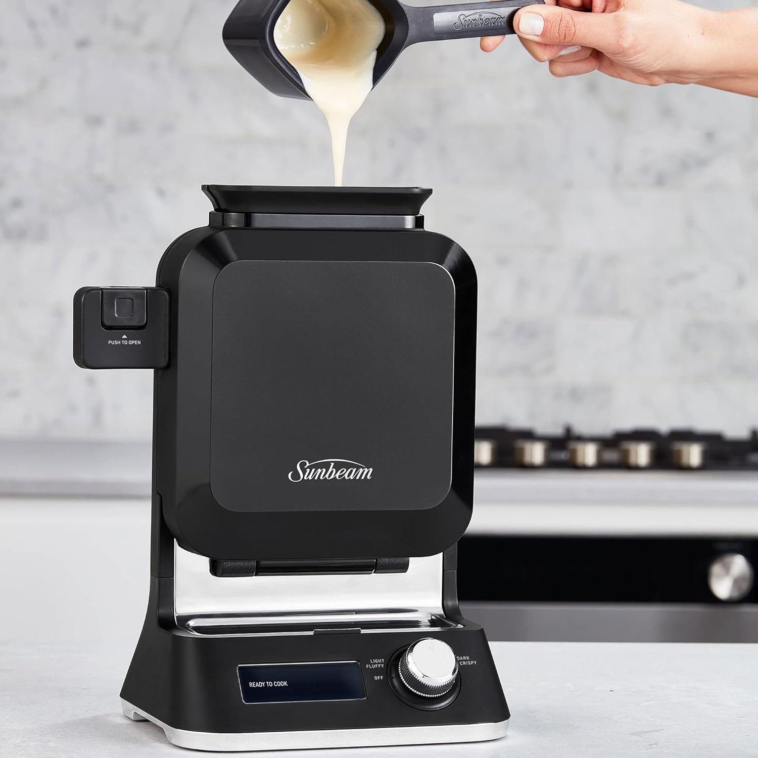 • The waffle maker will detect when batter is added through the funnel and the timer will automatically start to count down