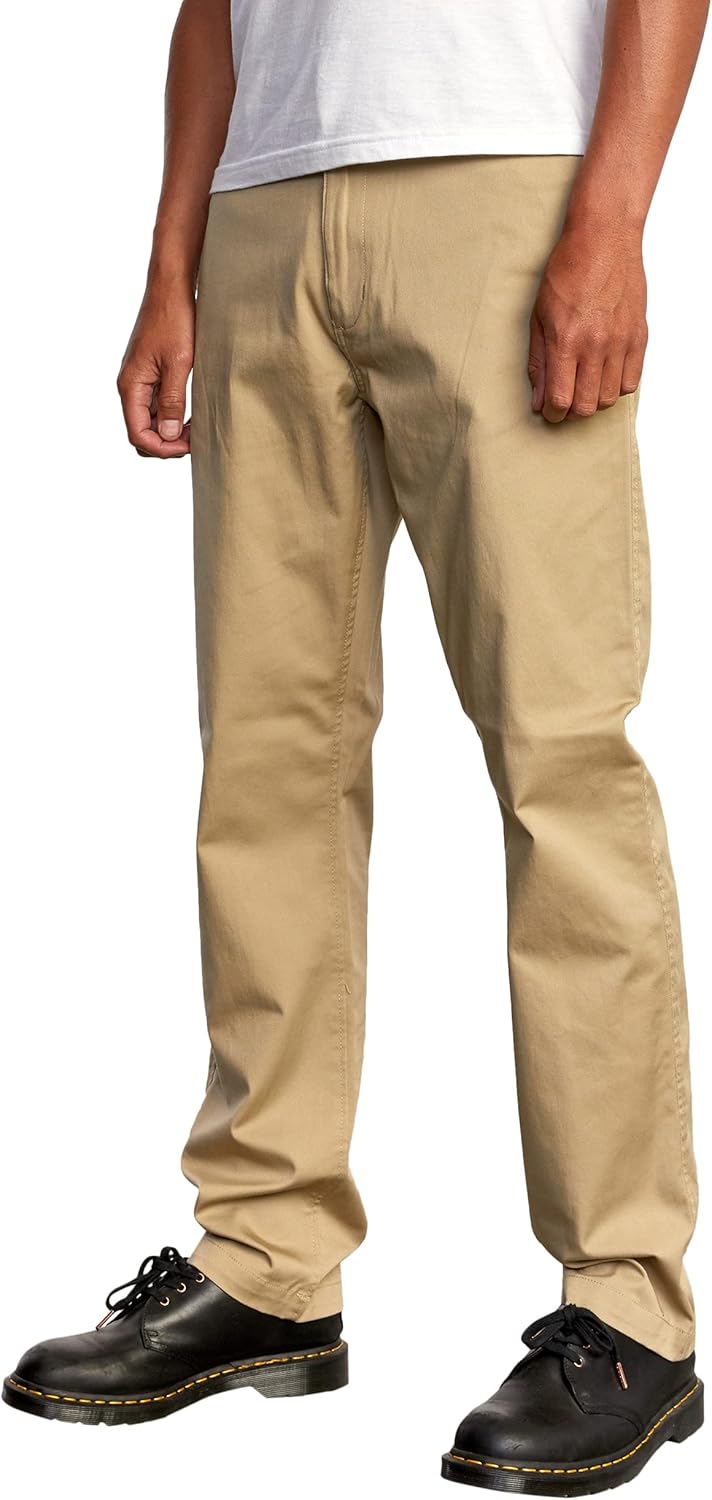 Straight Fit. Zipper fly with RVCA shank button closure. Inseam: 32in. Bottom Leg Opening: 15.5in. Front slash pockets with back welt pockets. Front Coin pocket.