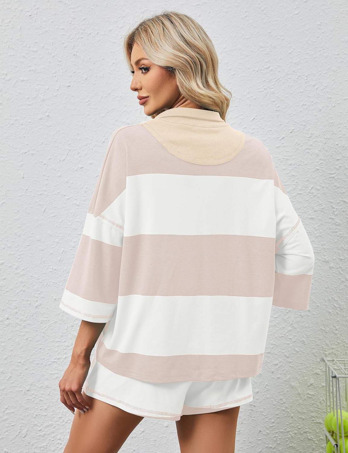 • Design: Striped element runs through this shorts set, and the collision of different colors brings a fresh visual impact, looking funny and trendy. The striped shirt features in a short sleeve, half zip, drop shoulder, and oversized fit designs, simple yet chic, which are suitable for most people. With wide leg design, this high waisted shorts can ensure your movement freedom. Quarter zip boxy tops elastic waist shorts set athletic set will be a staple piece for your summer outfits collections