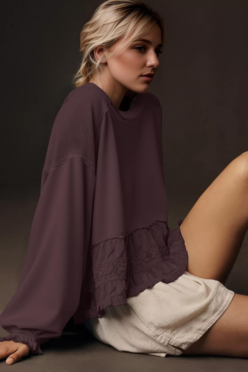Ceputer Women Lace Patchwork Sweatshirt Long Puff Sleeve Crew Neck Babydoll Tops Loose Fit Flowy Peplum Pullover Top Size Chart S-L(INCH) S: Bust-116cm/45.7", Length-56cm/22.0" M: Bust-120cm/47.2", Length-57cm/22.4" L: Bust-126cm/49.6", Length-58.5cm/23.0" XL: Bust-132cm/52.0", Length-60cm/23.6" Please allow 1~3cm by hand measurement Feature: Season: Spring, Fall, Winter Style: Cute, Casual, Trendy