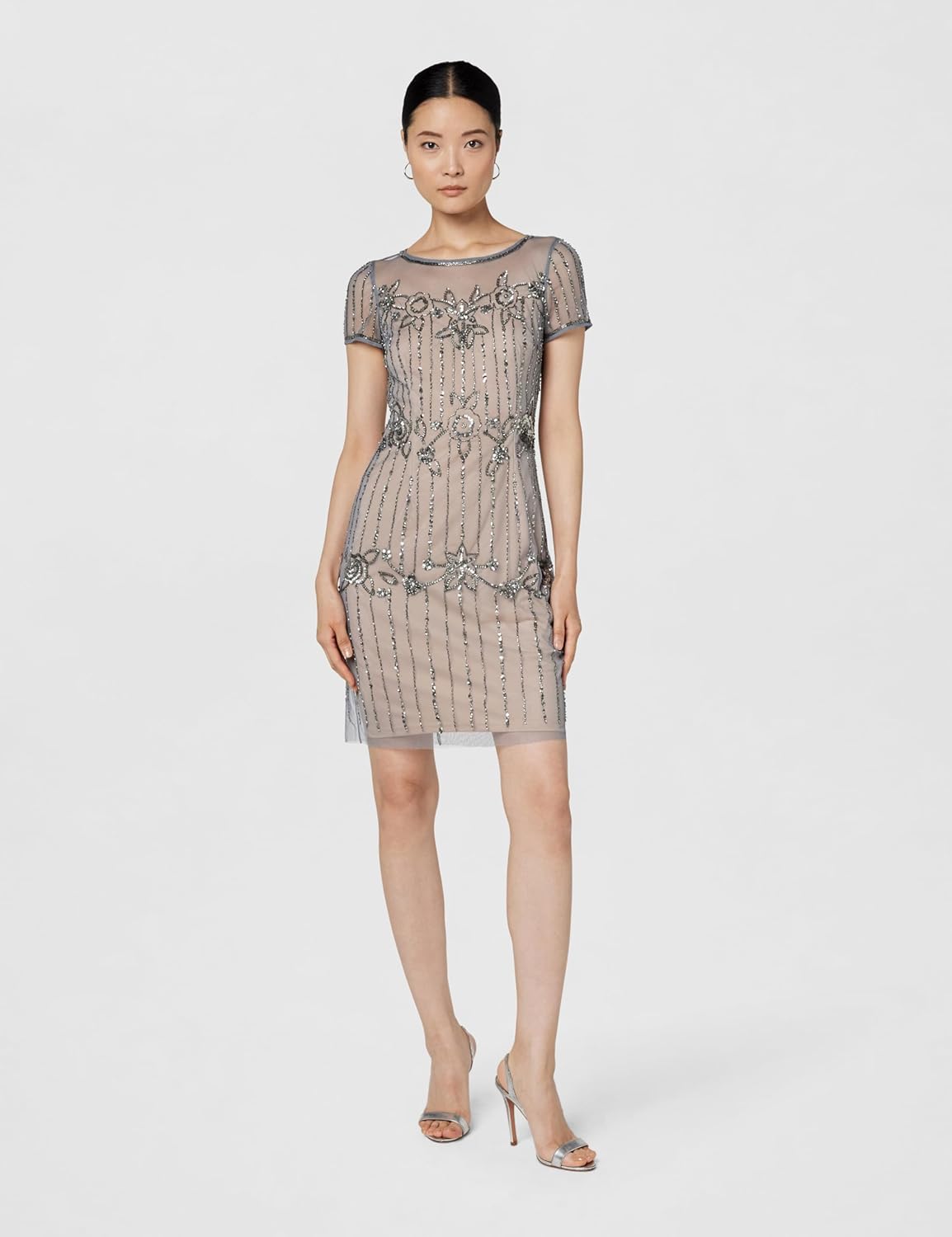 Dazzling and elegant, our midi cocktail dress turns up the heat with a brilliant display of allover hand beadwork. Designed in a streamlined silhouette that gently hugs your body. We love the modern square neckline and sheer illusion elbow sleeves. Perfect for wedding receptions and black-tie galas.