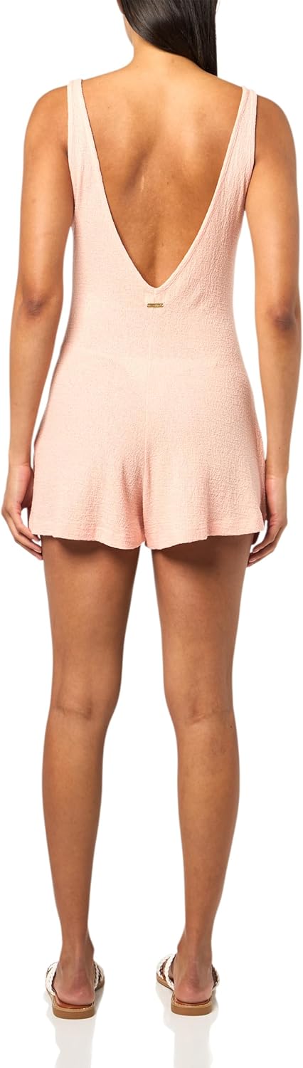 A knit romper with a flirty v-neck and 2" shorts cut from a soft cotton-poly jersey blend. The relaxed fit and textured fabric feel breezy for warm days, while the metal plate accent adds subtle edge.