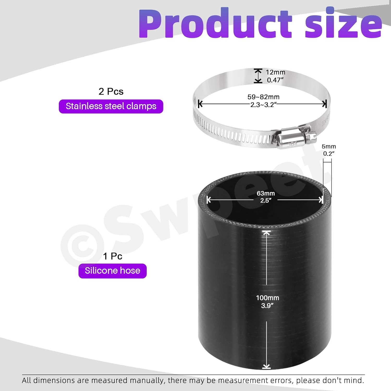 👑 Swpeet 1Pcs 4 Inch - 102mm 4-Ply Reinforced Straight Silicone Hose with 2Pcs 105-127mm 304 Stainless Steel T Bolt Hose Clamp Kit, Automotive Pure Silicone Hose for Turbo Intake Intercooler 👑 Why choose us 🏅 1. Good quality ✨ The hose is made of high-quality silicone, which is resistant to high temperatures, UV rays, and ozone. If you have any dissatisfaction, please contact us immediately. 🏅 2. Performance upgrade ✨ Our silicone compounds have improved the flow rate of the engine cooling system and upgraded its performance. 🏅 3. Widely used ✨ Suitable for various harsh engine environments, extreme temperatures, and pressure ranges that require high performance levels. 👑 Specifications: ✨ Material: Silicone ✨ Color: Black ✨ Dimensions: Inner Diameter: 4 Inch (102mm); Thickness: 0.2 Inch (5mm) ✨ Usage: Very suitable for automotive and industrial use, customized turbine or intercooler pipeline manufacturing 👑 The package includes: ✨ 1Pc ------ 4-Ply Reinforced High Temperature Silicone Coupler ✨ 2Pcs ------ Stainless Steel T-bolt clamps ✨ In Total of 3Pcs