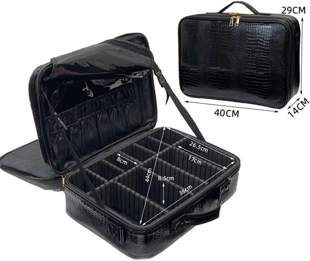 Large capacity vanity case with multiple storage compartments.Meet the needs of a wealth of cosmetics and tools. and easy to carry.Metal zipper design is more convenient to use.Great for storing manicures and skin care products for travel convenience.Material: PUColor: BlackSize: 40 x 14 x 29 cmUses: Nail Art/Makeup/Embroidery, etc.Package Contents:Cosmetic case*1 (excluding other demo products)notes:Due to manual measurement, please allow 1-3 cm error.Due to differences between different monitors, the pictures may not reflect the actual color of the item. Thanks!