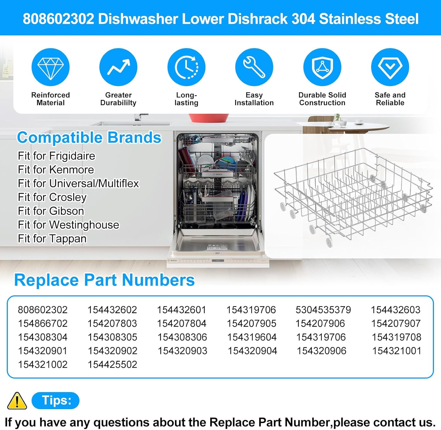 | Included Components | 1 X 808602302 frigidaire dishwasher lower rack (304 stainless steel),4× 154174501 Dishwasher rack wheels. |