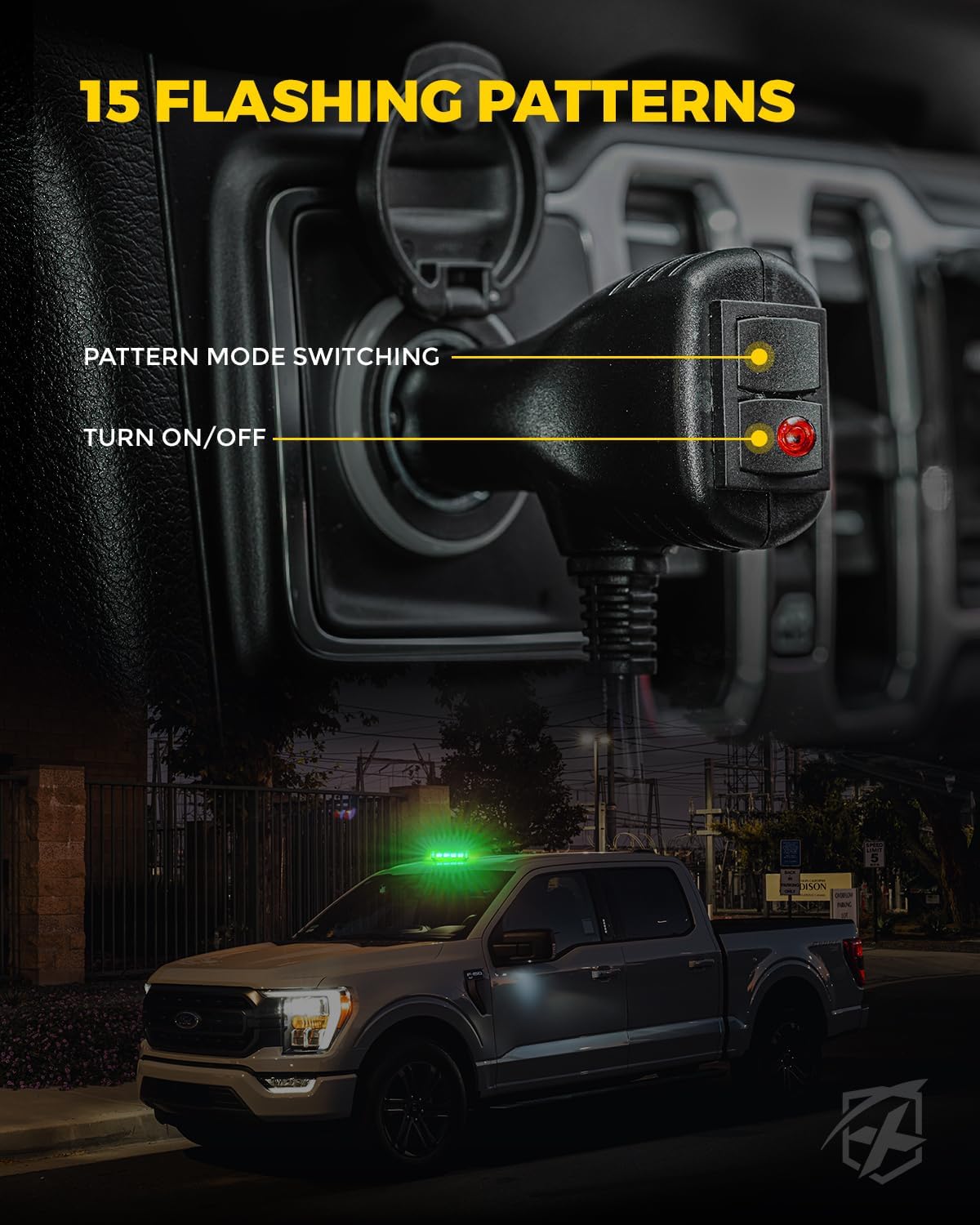 • 15 STROBE FLASH PATTERNS - 12V cigarrette plug with convenient dual switch design. 1 for easy power on/off. 2nd to change between 15 different flash modes, includes last pattern memory recall. Patterns include Rotating, Flashing, Alternating Between Left and Right Side, etc. These modes are sure to provide caution to potential upcoming hazards.