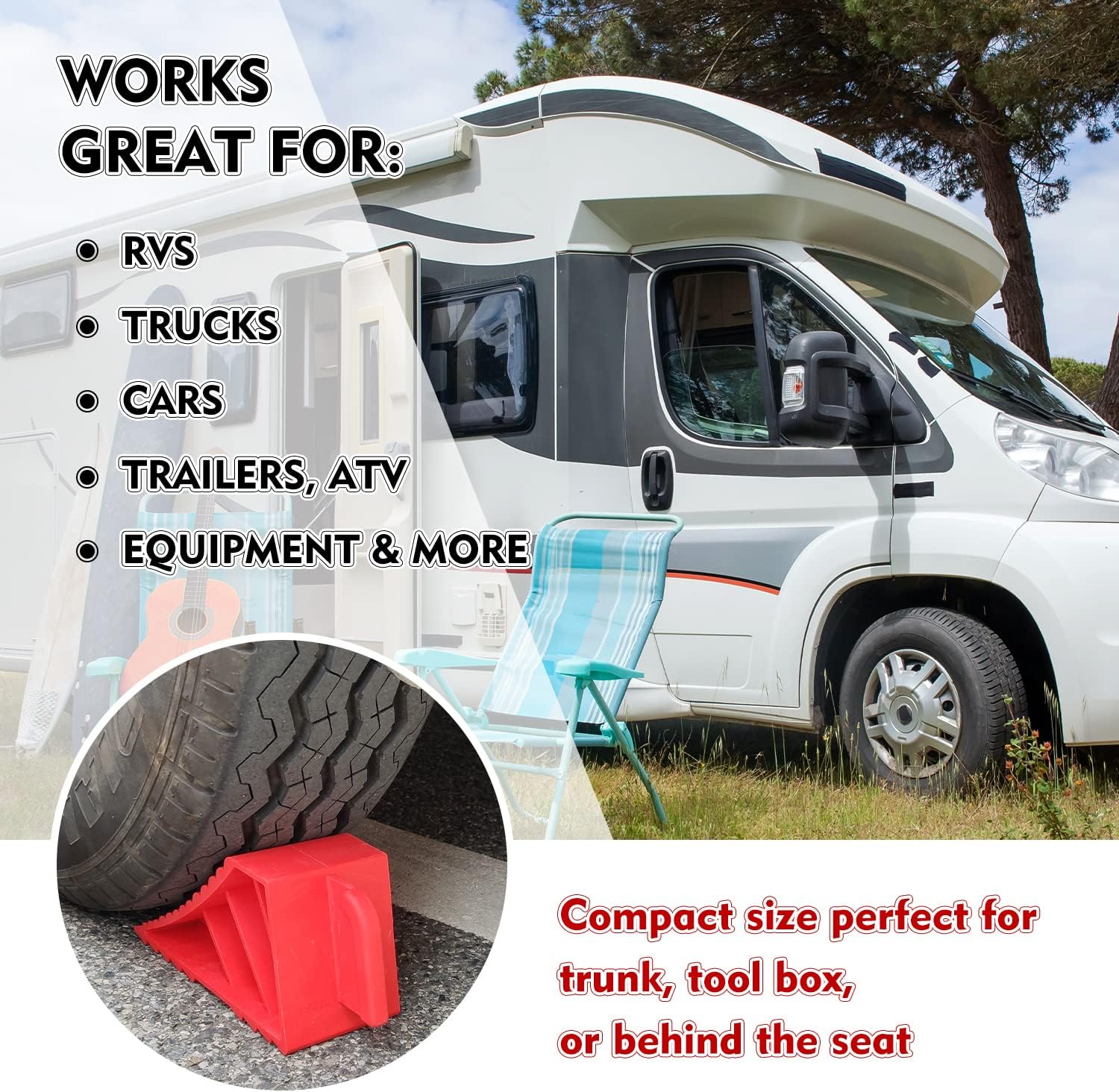 The jack stands are designed for car maintainance. Wheel chocks keep almost any car, camper or trailer in place.