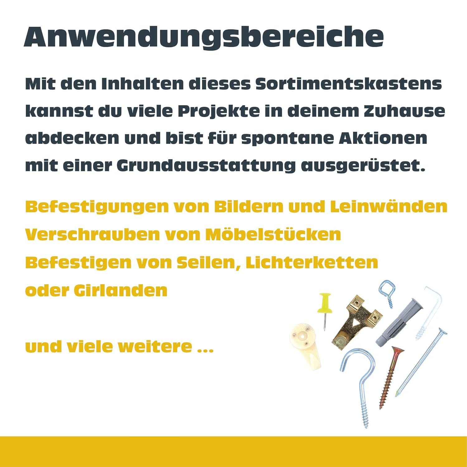 HELPMATE - Box of nails - 1200 pieces. Practical and always to use. With the nail assortment box from HELPMATE you will receive a complete package, which is delivered in an orderly and reusable box. The nails made of steel are galvanised, possibly painted and serve as wood-to-wood connections. The galvanised surface of the nails provides easy corrosion protection. The panel pins are also hardened and can therefore also be used on hardwoods and masonry. Thanks to the hardening, the panel pins are particularly robust. The countersunk head ensures a flush and smooth sinking. The grid structure on the countersunk head promotes impact as a higher friction is created. The nails from the Helpmate box can be used in many areas. The connection of wood to wood or the attachment of decorative wooden strips is particularly popular. Due to the additional hardening of the panel pins and the resulting robustness, the application is also extended to hardwood and masonry. Note: The hardening of the panel pins makes the material brittle and there is a risk of breakage and splintering. For your own safety, we therefore recommend wearing protective glasses when hammering.Box contents: wire pins: 180x 1.6x30mm150x 2.0x40mm100x 2.2x45mm80x 2.2x50mm70x 2.8x65mm60x 3.1x80mm40x 3.8x1 000mm00mmBlack pencils: 160 x 1.75 x 25 mm, 100 x 1.75 x 40 mm. Panel pins dark beige: 160 x 1.75 x 25 mm, 100 x 1.75 x 40 mm. The dimensions of the entire Helpmate box are 335 x 205 x 60 mm.
