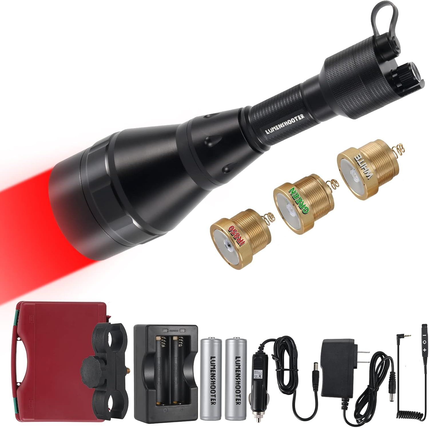 LUMENSHOOTER D8A Deluxe Night Hunting Kit with Dimmable Green, Red, Infrared 850nm and White Intensity Control LED's for Predator, Coyote, Varmint & Hog.B2 Blood Tracking Light, Powerful Hunting Flashlight for Nighttime Deer Or Elk Blood Trail Tracking.