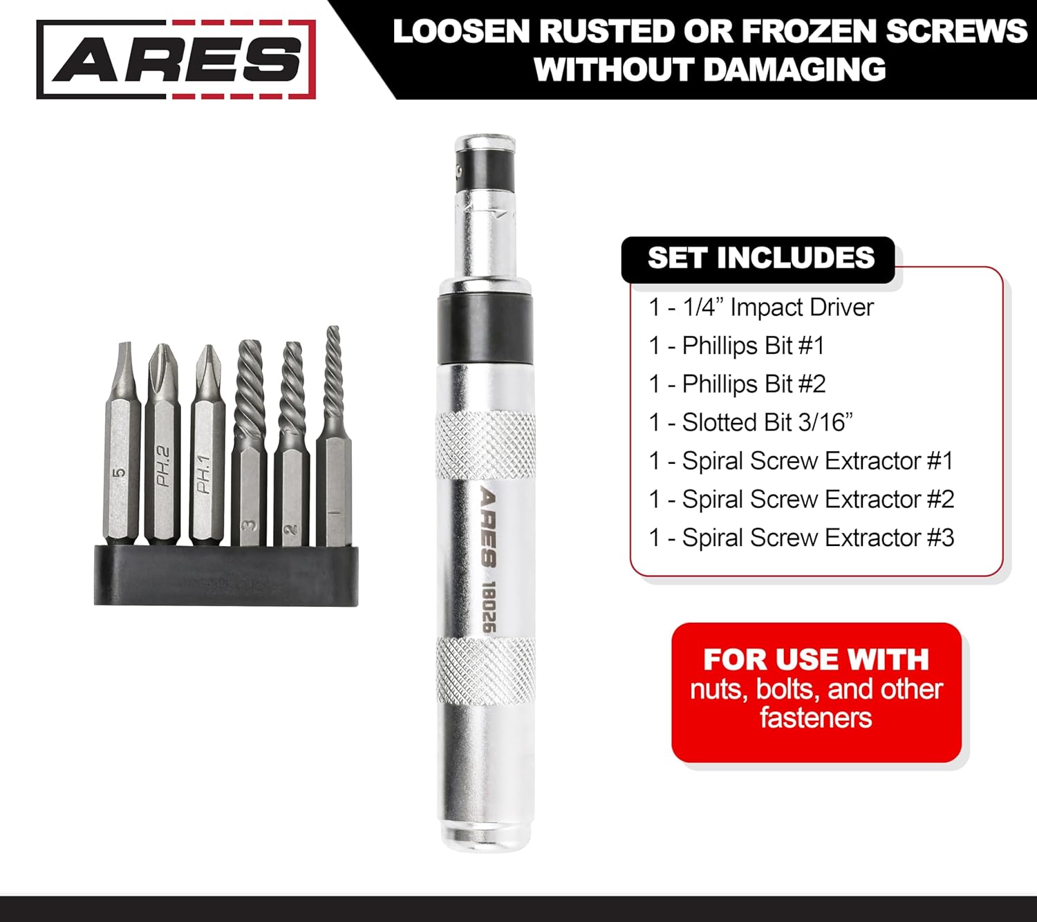 ARES 18021-1/2-Inch Manual Reversible Impact Driver - Standard and Long Slotted 5/16 & 3/8 and Phillips #2 & #3 Bits - Disengage Brake Caliper Screws and Rusted or Frozen Fasteners