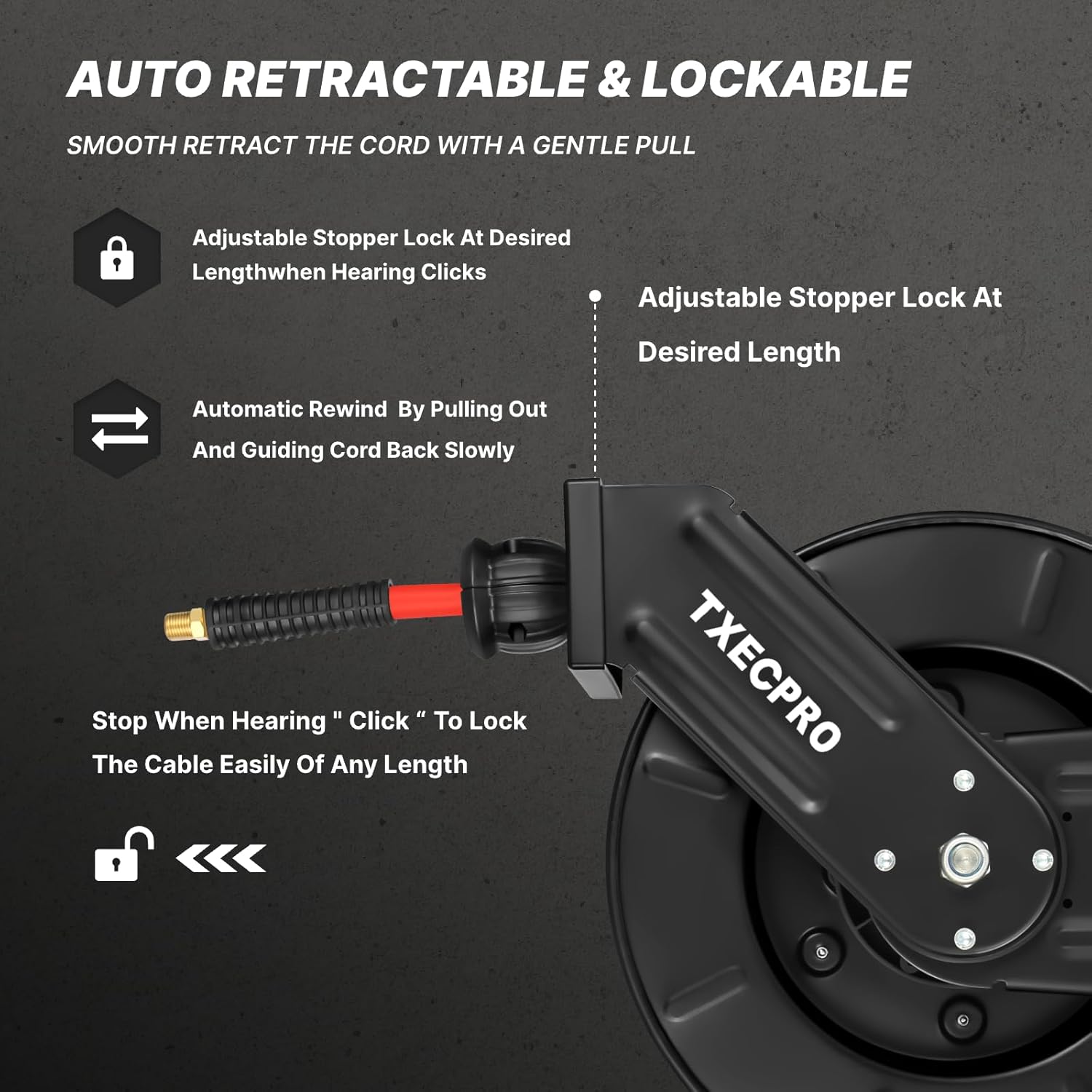 • 【Auto Rewind】The Auto-Rewind air compressor hose reel makes it easy to use your hose without any kinks. Simply give the hose a gentle tug and it will retract smoothly. You can adjust the stopper to lock at any length as you need