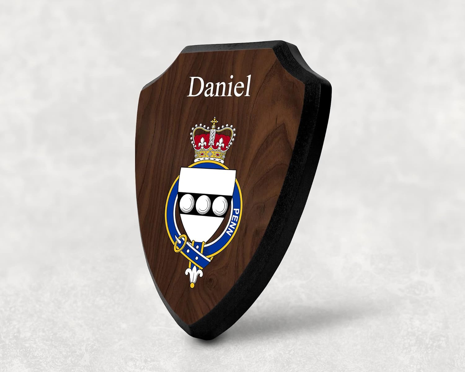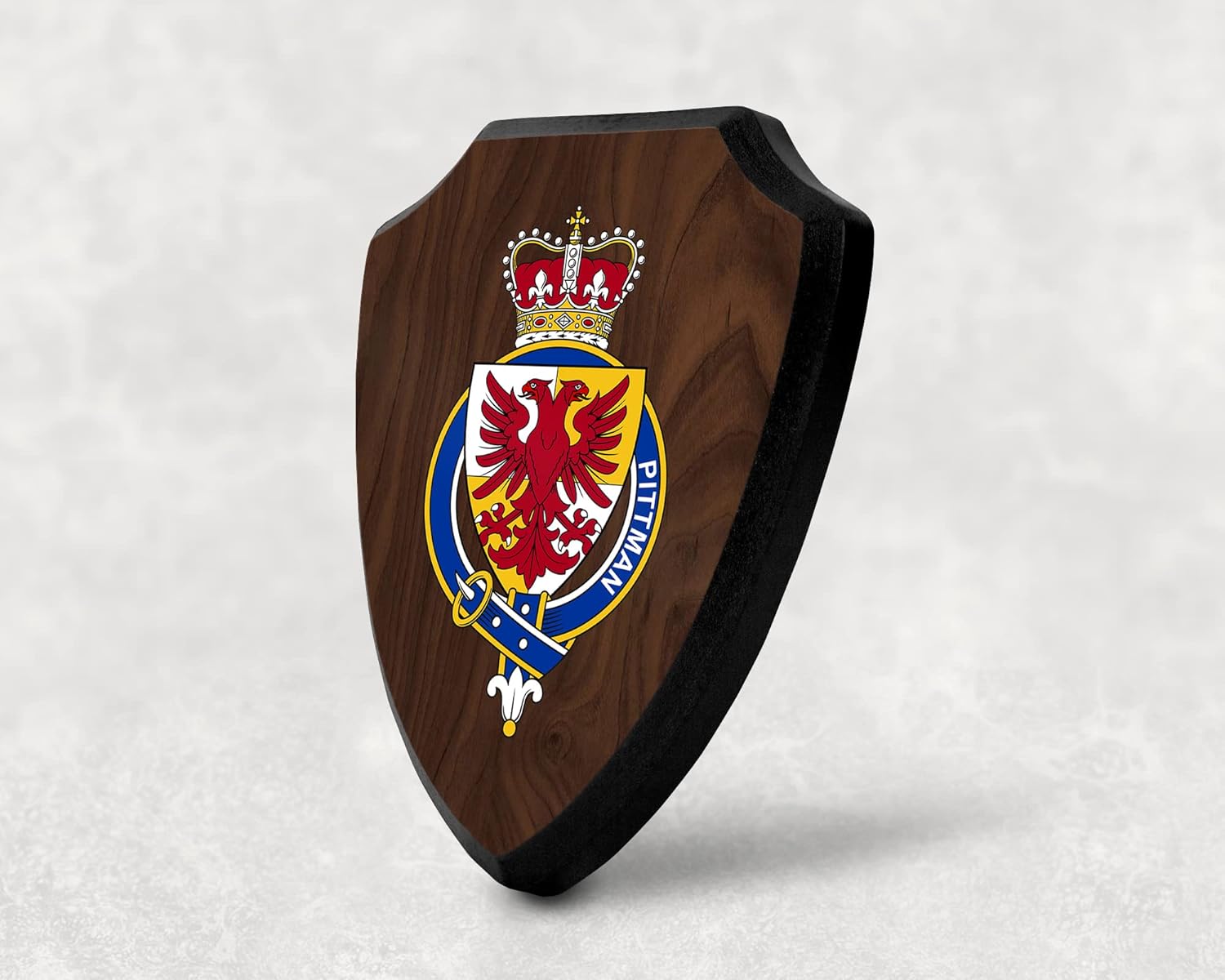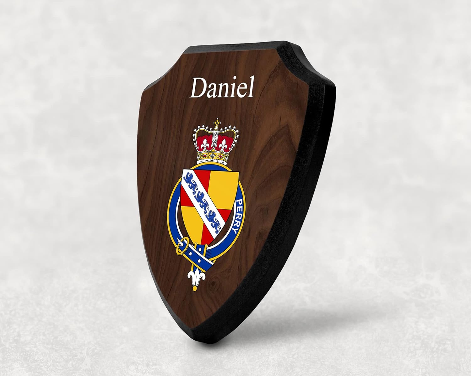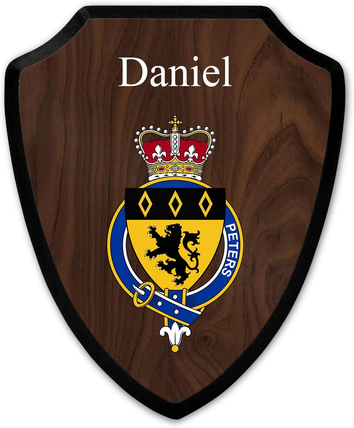 This beautifully crafted shield-shaped plaque is the perfect way to display your family crest, and personalize it with your name. Measuring 7.75 inches wide by 9.125 inches tall, this plaque is the ideal size to be displayed on a wall, door or any other place of your choice. The plaque is sublimated, meaning the image of your family crest is infused into the surface of the plaque, ensuring the design will not fade or peel over time. This process also allows for vibrant and long-lasting colors that truly make your crest stand out. With its smooth edges and high-quality finish, this plaque is sure to be a treasured family heirloom for years to come. The back of the plaque has an inset hole which enables easy hanging, giving you flexibility in where to showcase it. Whether you choose to display it in your home, office, or give it as a gift, this sublimated shield-shaped plaque is a stunning way to celebrate your family heritage. Fully customize your name by clicking the “Customize Now” button.
