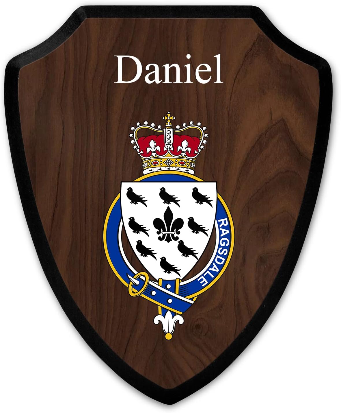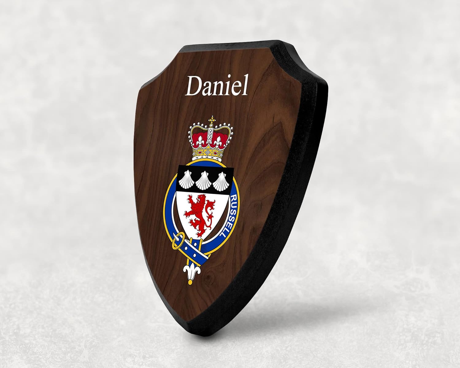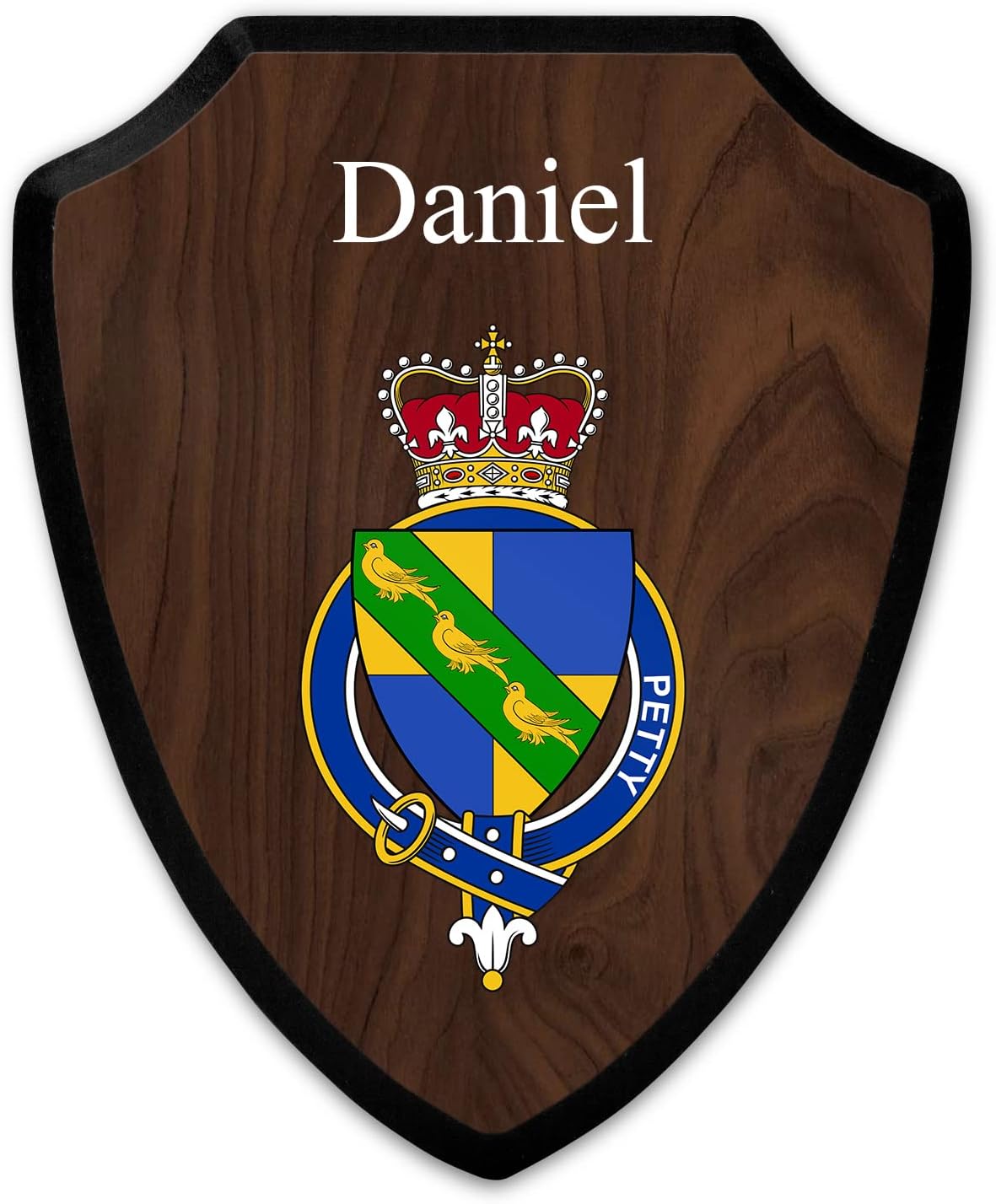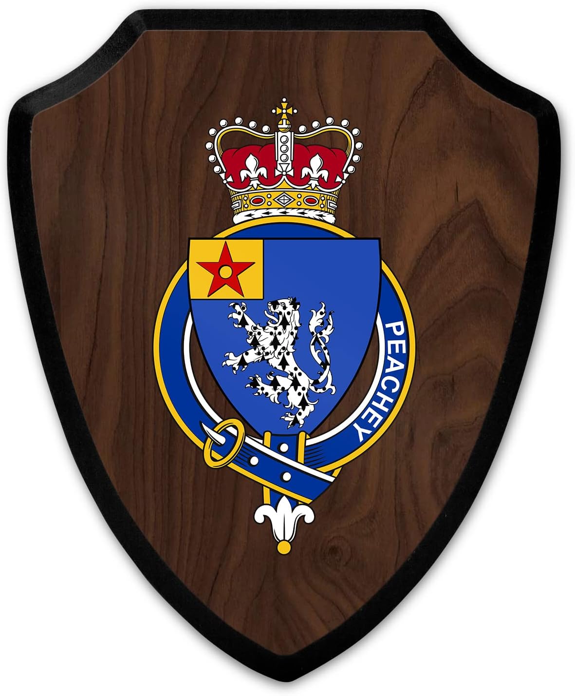 This beautifully crafted shield-shaped plaque is the perfect way to display your family crest, and personalize it with your name. Measuring 7.75 inches wide by 9.125 inches tall, this plaque is the ideal size to be displayed on a wall, door or any other place of your choice. The plaque is sublimated, meaning the image of your family crest is infused into the surface of the plaque, ensuring the design will not fade or peel over time. This process also allows for vibrant and long-lasting colors that truly make your crest stand out. With its smooth edges and high-quality finish, this plaque is sure to be a treasured family heirloom for years to come. The back of the plaque has an inset hole which enables easy hanging, giving you flexibility in where to showcase it. Whether you choose to display it in your home, office, or give it as a gift, this sublimated shield-shaped plaque is a stunning way to celebrate your family heritage. Fully customize your name by clicking the “Customize Now” button.