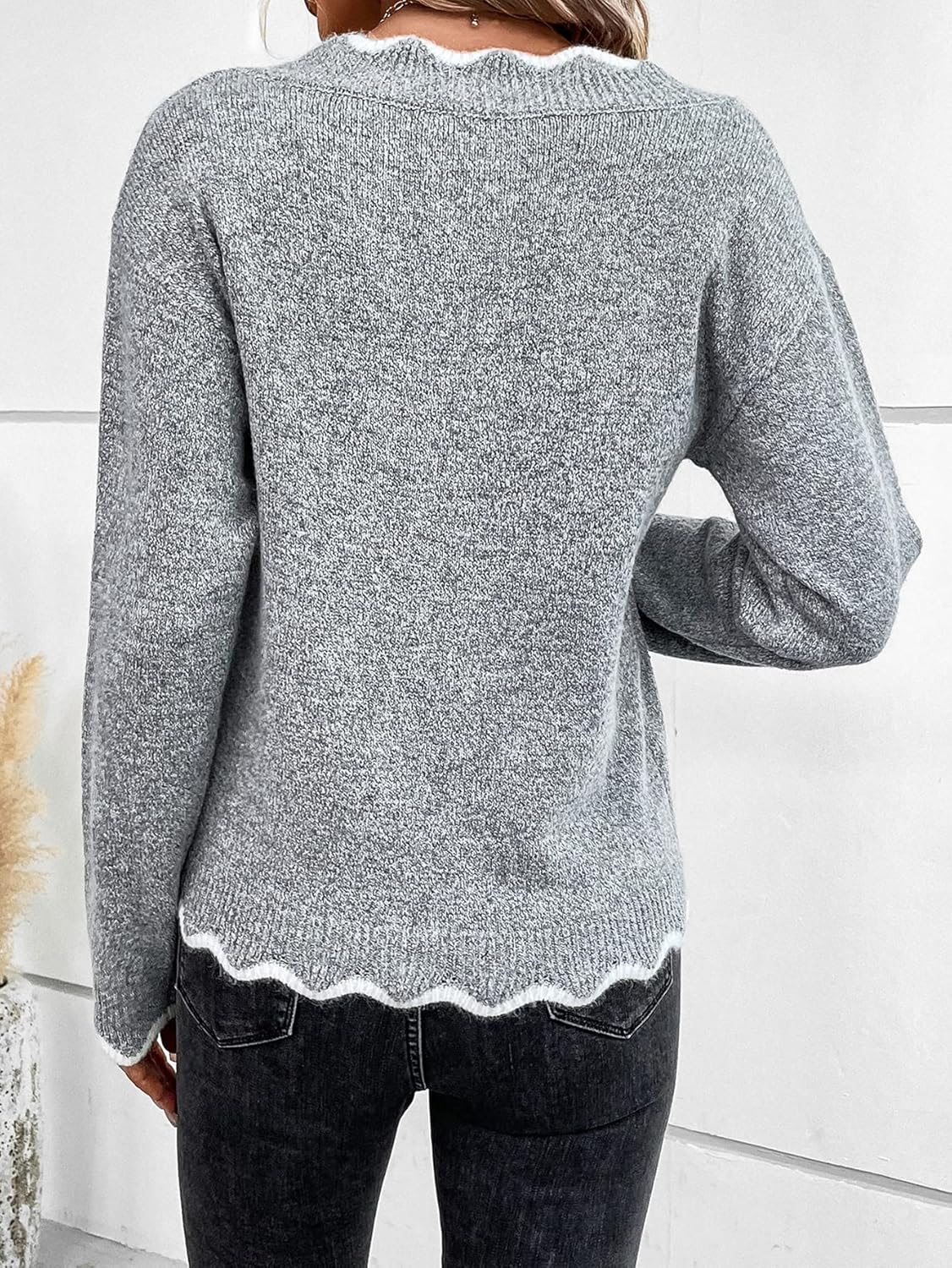 SBicep Length : 14.6 inchBust : 37.8 inchCuff : 8.7 inchLength : 23.6 inchShoulder : 19.1 inchSleeve Length : 20.9 inchMBicep Length : 15.1 inchBust : 39.4 inchCuff : 9.1 inchLength : 24 inchShoulder : 19.9 inchSleeve Length : 21.1 inchLBicep Length : 15.9 inchBust : 41.7 inchCuff : 9.5 inchLength : 24.6 inchShoulder : 21.1 inchSleeve Length : 21.4 inchColor: Light Grey,BlackStyle: CasualPattern Type: PlainDetails: Rib-Knit,Contrast Binding,ScallopType: PulloversNeckline: V neckSleeve Length: Long SleeveSleeve Type: Drop ShoulderLength: RegularFit Type: Regular FitFabric: Medium StretchMaterial: FabricComposition: 100% PolyesterCare Instructions: Machine wash or professional dry cleanSheer: No