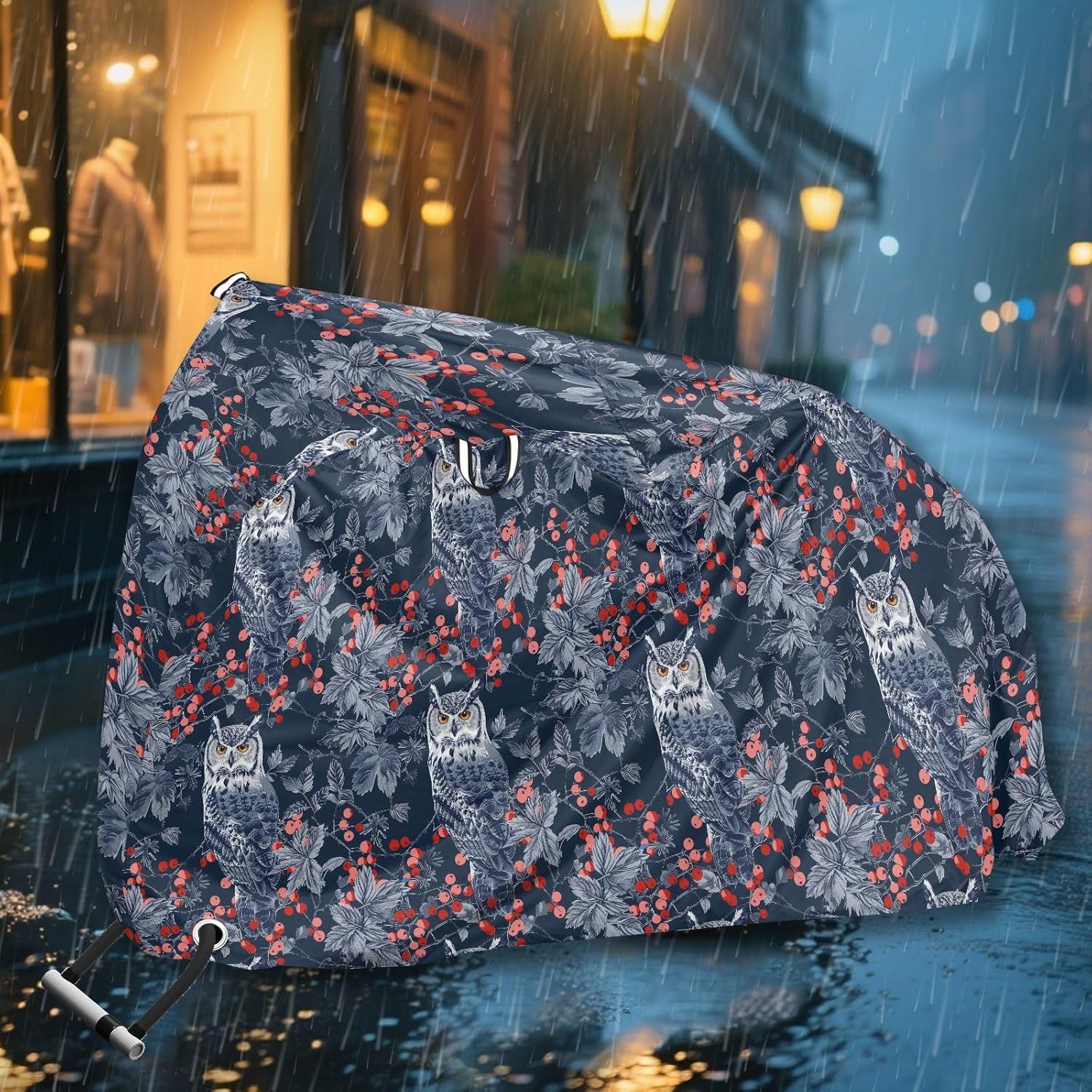 Protect your bicycle in style with our premium bike tarp, engineered for maximum defense against harsh elements. Unlike basic covers, we use specially engineered umbrella waterproof fabric - the same advanced material used in high-end rain umbrellas - delivering superior performance with unique visual appeal. Sun & Heat Defense Our fabric creates a physical cooling barrier that actively lowers your bike's temperature by: Blocking 95%+ harmful UV rays to prevent paint fading Providing exceptional shading & heat insulation (up to 20℉/11℃ reduction vs direct sun) Offering SPF 50+ equivalent protection for sensitive components Rain & Dust Protection Water-repellent coating causes rain to bead and roll off Tightly woven fabric acts as dustproof barrier for long-term storage Prevents moisture buildup with breathable side panels (prevents condensation) User-Focused Design LOCK ACCESS HOLE at front wheel enables secure locking without removing cover ADJUSTABLE BUCKLE STRAP at rear wheel anchors cover during strong winds Reflective safety strips on handles enhance nighttime visibility Ultra-lightweight (23 oz) folds into included pouch Unbeatable Aesthetics Choose from over 1,000 designer patterns - from sleek geometrics to vibrant nature motifs - transforming your bike into a street-style statement while competitors offer only solid colors.