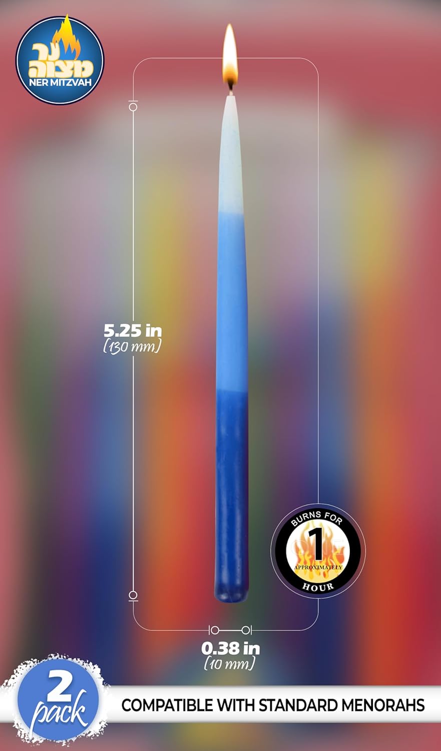 LIGHT UP THE NIGHTA favorite for so many, celebrating Chanuka is a highlight of the year. Of all the holiday traditions, kindling the Menorah is the main event. Lighting the Hanukkah candles for menorah while reciting the blessings and singing traditional hymns brings the family and friends together to celebrate, young and old alike.Ner Mitzvah’s variety of Chanukah candles allows you to choose a size, color and design that you love to celebrate the holiday in style. Whether you prefer classic, traditional, colored, or modern candles hanukkah, we have the perfect candles to put the finishing touches on your menora and make it look spectacular.! Choose from chanukah candles standard size, chanukah candles white, natural beeswax hanukkah candles, fun multi-color designs, or funky themes.Celebrate the Festival of Lights with plenty of chanukah candles dripless to last you through all 8 nights, just like the miraculous oil jug in the Holy Temple. Our 45-count boxes include enough candles to light one menorah, including the shamash, on each night of the holiday.PRODUCT FEATURES:Kosher - Meets All Halachic RequirementsStays Lit for 1 HourPremium Quality WaxStandard Size 3/8” (10mm) DiameterFits Most Menorahs45 Count Per BoxCUSTOMIZE YOUR CANDLESKindle the perfect Chanuka candles to compliment your chanukiya & create a dazzling display!Choose from: Short 4” or Long 5” Multicolored, Blue & White, Metallic, Pastels or Natural Beeswax Chanukah Candles Straight & Smooth, Spiral, Wavy, Criss-Cross or Honeycomb Dreidel, Star of David, or “Happy Chanukah” ArtABOUT NER MITZVAHFamily-operated since the 1940’s, Ner Mitzvah is an expert candle-maker, delivering a wide selection of products at the highest quality with personal customer service. Count on us for Shabbat, Havdalah, and Chanukah candles and oil lamps as well as related Judaica.