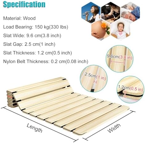 Wooden Bed Board: Are you looking for an ultra minimalist bed frame? Do you still struggle with not being able to get into a deep sleep at night rest? Or are you still woken up by a squeaky mattress? With our wooden slats, you can enjoy a more hygienic and comfortable sleep, waking up feeling refreshed and energized. Specification 1. Material: Wood 2. Load Bearing: 150kg(330 Ibs) 3. Slat Wide: 9.6 cm(3.8 inch) 4. Slat Gap: 2.5 cm(1 inch) 5. Slat Thickness: 1.2 cm(0.5 inch) 6. Prior to placing your order, please measure the width of your bed to ensure these slats are a perfect fit. Features 1. Thickened anti-skid pad at the bottom, anti-skid design, no noise impact 2. Great replacement for broken or damaged bed slats 3. The mattress will not sag through the plank support gap 4. It helped a too soft mattress and the support and air circulation your mattress needs 5. Rounded edges and corners to avoid knocks 6. Great for lofts and other low-clearance/sloped ceiling bedrooms 7. It can be rolled up and folded for easy storage 8. The even spacing between the slats facilitated by the fabric banding was easy to just roll out on the frame Package Content 1× Bed Slat (Wood Slats Only, Bed Frame Not Included) Notice 1. If a slight odor is normal, it will disappear within two to three days. 2. Please confirm the size before purchasing. Please allow 1-3cm size deviation due to manual measurement.