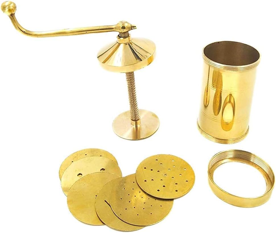 TreegoArt Pure Brass Sev Chakli Gathiya Sevaia Maker with 6 Different Jali Removable Bottom Sancha Murukulu Janthikulu Press Machine - Pack Of 1 Sale For : Pack Of 1Type : Sev Chakli MakerMaterial : Brass Care Instruction : Dishwasher Safe Body Material : BrassPattern : Solid ABOUT THIS ITEM✤ Chakli maker machine has a unique and convenient design that allows you to prepare your favorite Indian snacks, Murukku, Farsan Sev, Gathia, Chakli, etc.✤ Functionally designed, safe and most reliable, kitchen appliances for modern kitchen.✤ Easy Preparation Utensil – You only need to decided what you want to make and in what shape. Place your chosen disc template inside the cyclinder and then add your preffered homemade dough inside.✤ Handles are specifically designed to provide firm, easy and comfortable grip .✤ Easy to use and operate, making it suitable for both beginners and experienced cooks.