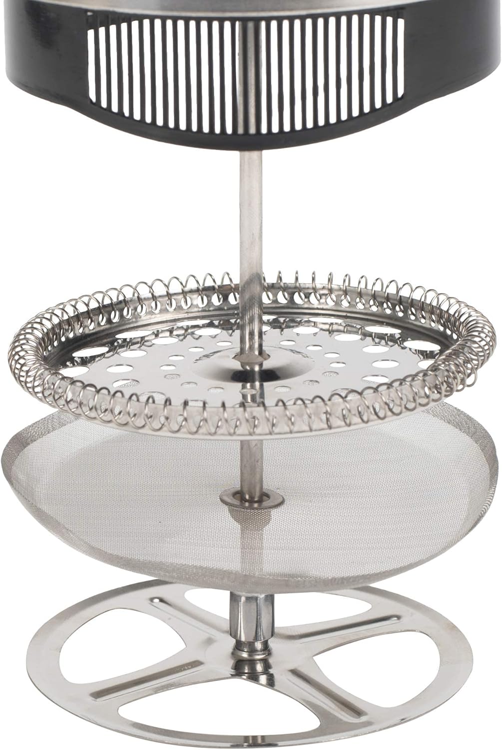 French press is made of glass and stainless steel with chrome tone finishing, matte black handle, and plunger with removable glass exterior; Lid includes mesh spout for easy non-spill pouring. French press is easy to use and easily detachable for cleaning; Three layer filter traps the smallest grounds; Will make 8 small cups or 4 standard cups of coffee or tee at a time. Includes 4 matching coffee mugs with matte grey finish; Made of sturdy stoneware and holds approximately 17 ounces of your favorite beverage. Mugs are top rack dishwasher and microwave safe, but handwashing is recommended for longest lasting finish. Contained in protective packaging.