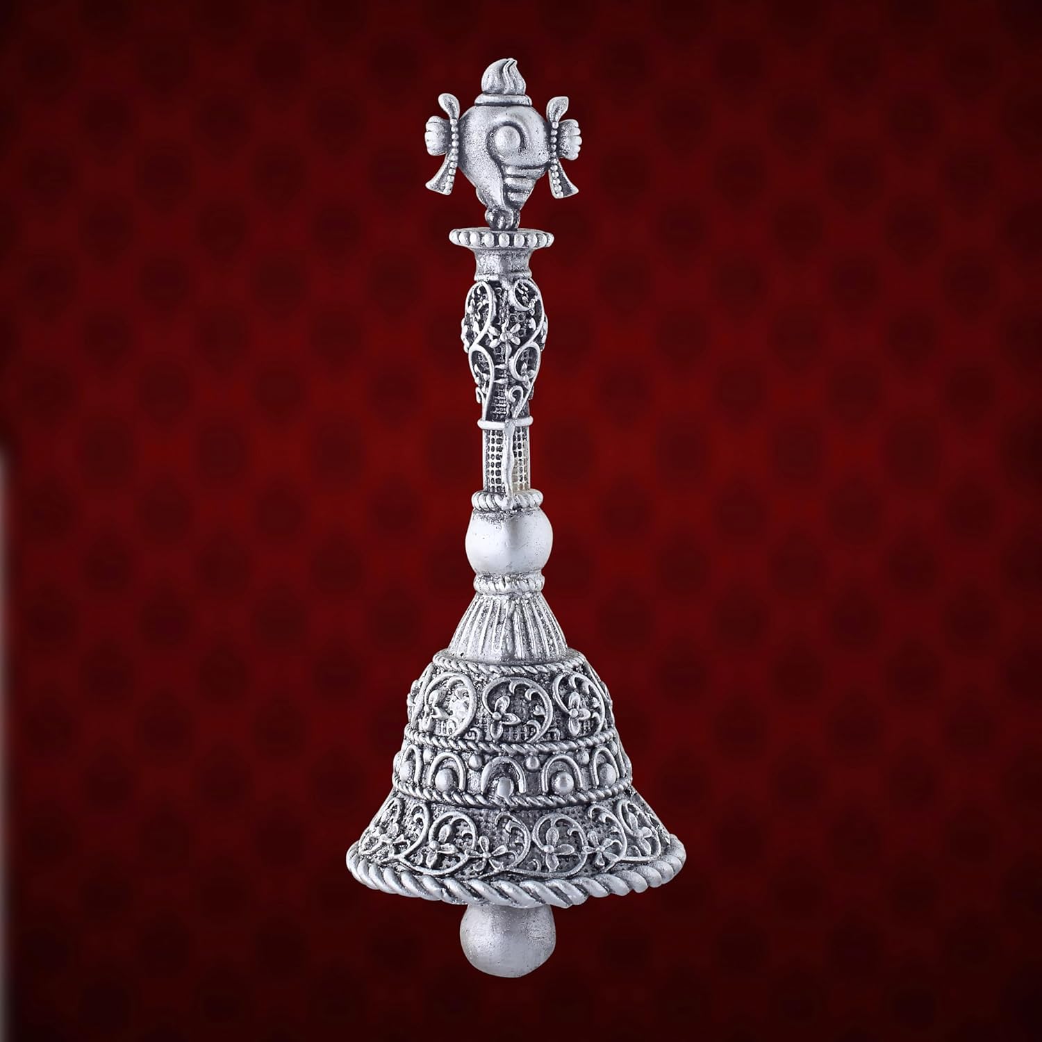Add a touch of spiritual elegance to your sacred space with this exquisitely crafted Pooja Bell. Featuring an antique silver finish that exudes timeless charm, this decorative bell showcases intricate floral patterns and ornate detailing throughout its tiered design. The bell's body displays masterful craftsmanship with its layered architecture, adorned with delicate scroll work and traditional motifs. The elongated handle is beautifully embellished with filigree work, crowned by a distinctive top piece that adds character to the overall design. Perfect for traditional ceremonies or as a stunning decorative piece, this bell combines functionality with artistic beauty. The substantial weight and detailed construction speak to its quality, while the classic antique silver finish ensures it complements any traditional or contemporary decor. Whether hung in a temple room, meditation space, or as an artistic accent piece, this Pooja bell serves as both a spiritual tool and a remarkable piece of decorative art.