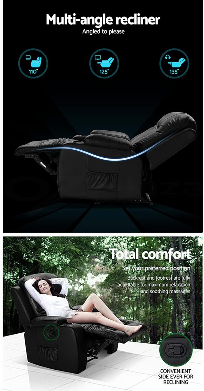 Sit back and relax with the Artiss Recliner Chair. With its 8-point massage and 2-point heating function, you can get soothing massages with the recliner at all the right places. Upholstered in fine quality PU leather, the recliner is an oasis for plush comfort. The sturdy steel base also allows a weight capacity of up to 180kg. The contoured backrest provides good support with multi-angle tilt adjustment to suit sitting positions for your favourite pastime activities. Plus, an adjustable footrest lets you put your feet up in style. Elsewhere, you will enjoy the ultra-wide armrests, double cup holders and two large side pockets for all your essentials close at hand. Not least, it comes with a handy remote control to turn on everything at your fingertips.Features:Premium PU LeatherRecline up to 135 degreeHigh resilience sponge paddingContoured seatingAdjustable backrest and leg rest (pull out manually)8-point massage and 2-point heatingRemote controlTwo cup holdersSide pockets on both sidesSturdy steel baseUltra-wide and thick padded armrestMulti-angle tilt adjustmentSAA-certfified Specifications:Brand: ArtissCover: PU LeatherFilling: SpongeOverall dimensions: 83cm x 95cm x 105cmUnfolded length: 163cmWeight capacity: 180kgColour: BlackAssembly required: YesNumber of packages: 1 Product Contents:Artiss Massage Recliner Chair x 1Assembly Manual x 1
