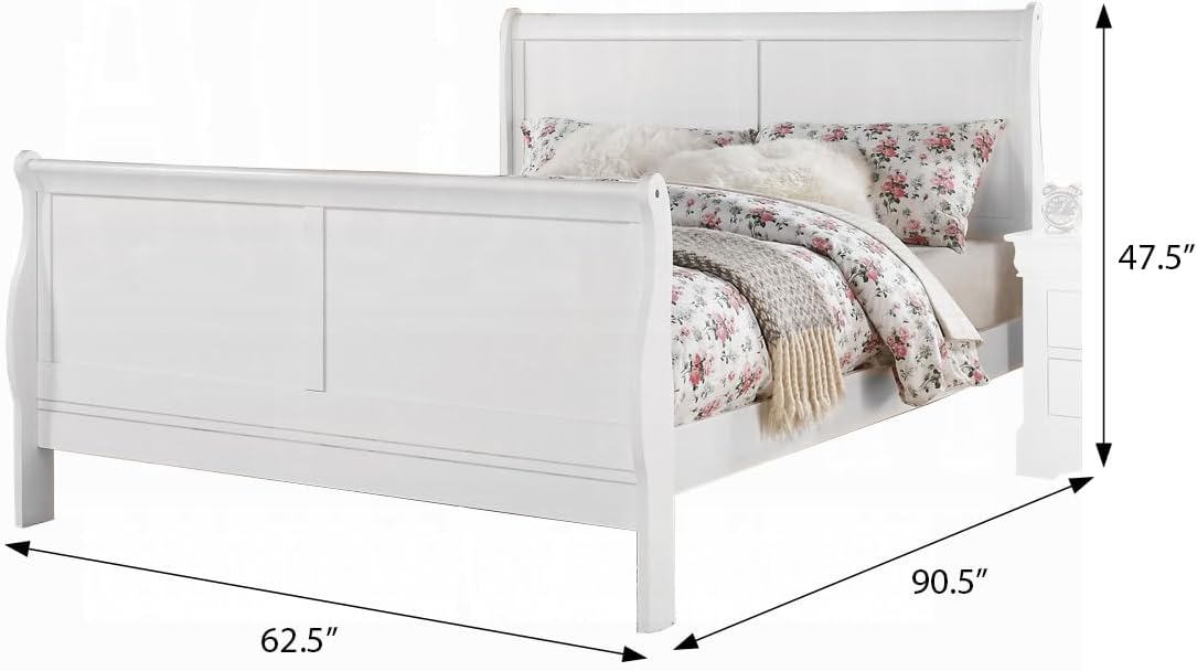 Product Dimensions: 62.5W x 90.5D x 47.5H in Bed Size: Queen Material: Solid Pine, Gum Wood, MDF, Particle Board Color: White Bed Type: Sleigh Bed Box Spring Requirements: Box Spring Required Weight Capacity: Supports standard queen mattress with box spring Storage: Integrated casegood drawer for extra bedroom organizationExperience the perfect blend of classic design and practical functionality with this White Queen Sleigh Bed. Its timeless curved headboard and sturdy construction bring sophistication and durability to your bedroom. Crafted from a combination of solid wood and engineered wood materials, this bed frame ensures stability and longevity. The built-in storage drawer adds convenient space to store linens or personal items, helping you maintain a tidy room. Designed to be used with a box spring, it offers enhanced mattress support for comfortable and restful sleep. Ideal for traditional bedroom decor, this queen bed measures 62.5 inches wide by 90.5 inches deep and stands 47.5 inches tall, making it a refined centerpiece for your home.
