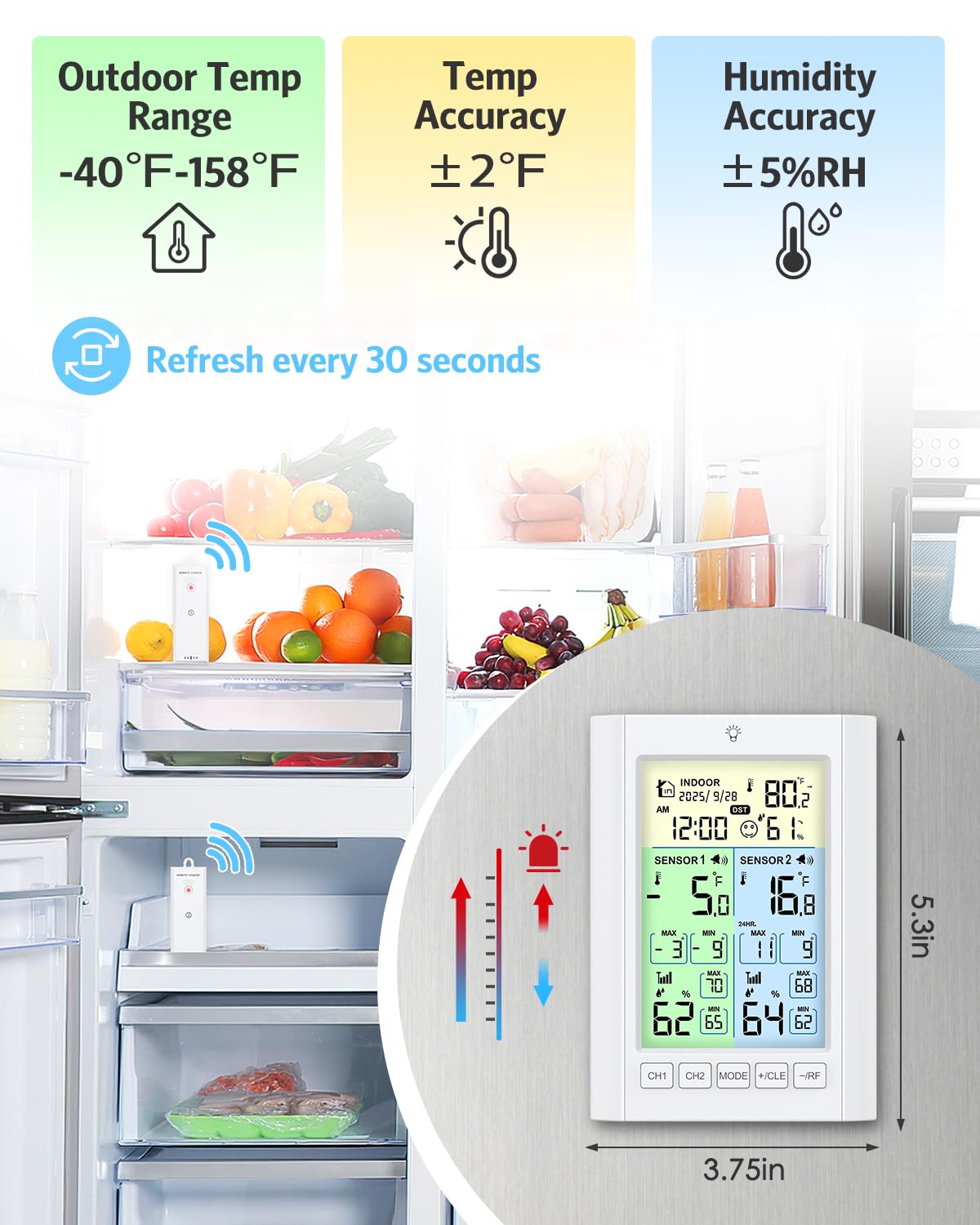 Temracha Wireless Refrigerator Thermometer with Alarm Digital Fridge & Freezer Thermometer with Backlight, MAX/MIN Record, Rechargeable Battery, for Home, Kitchen, Restaurant