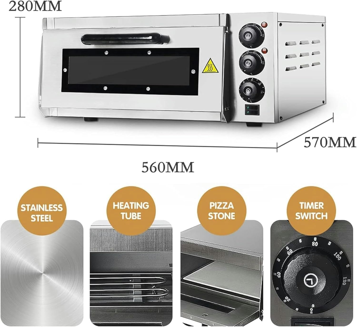 Electric Pizza Oven 2KW Commercial Oven Single Stone Stainless Steel Toaster 110/240V MultifunctionName: Single-layer stone electric commercial pizza oven (with pizza stone)Model: K-P1STVoltage: 110/240V, 50/60HzCertificate: CESize: 56*57*28cmStone size: 395*395*13 mm * 1 pcs (16'')Net weight: 19 kgTemperature range: 50~350℃feature1. All 201 stainless steel structure, sturdy and durable.2. Upper and lower heating elements, fast heating, independent heater control, easy to use.3. Using the time controller, set the baking time you want.4. CE certificate.This oven can not only bake pizza, but also make a variety of foods such as potato bread, cakes, pies and pastries.
