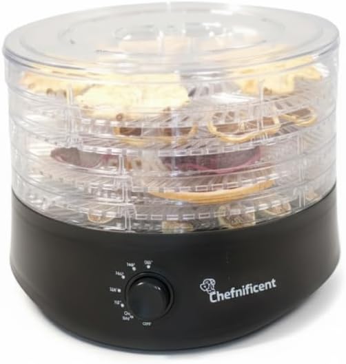 Chefnificent FD704M Food Dehydrator – Fast, Healthy Snacking Made SimpleCreate delicious, preservative-free snacks at home in a fraction of the time. The Chefnificent FD704M food dehydrator is designed for speed, power, and convenience. With an advanced airflow system and wide heating element, this meat dehydrator dries fruits, vegetables, herbs, and meats in just 4 hours or less, quicker than traditional food dehydrator machines, with consistently perfect results.Featuring five BPA-free, stackable trays, this fruit dehydrator machine provides flexible capacity for drying multiple ingredients simultaneously. The transparent design allows you to monitor progress at a glance, while the central flow heating system ensures even heat distribution across every tray, eliminating the need to rotate.Key Features:4-Hour Fast Drying: Powerful airflow and wide heating efficiently dehydrate fruits, veggies, herbs, and meats in 4 hours or less, saving time without compromising results.BPA-Free Adjustable Trays: Includes 5 transparent, stackable trays made from BPA-free materials, offering safe, flexible space for all your favorite ingredients.Even Heat Distribution: Central flow air system delivers steady, uniform heat across all levels. Say goodbye to uneven drying and hello to perfect texture every time.Easy Temperature Control: Simple, intuitive dial gives you precise control over drying temps, ideal for everything from delicate herbs to tough jerky.Safe & Space-Saving Design: Crafted with food-safe, durable materials in a compact footprint that fits any kitchen, easy to store, clean, and use daily.Whether you’re crafting dried fruit, vegetable chips, beef jerky, or homemade pet treats, the Chefnificent FD704M provides the tools to preserve food naturally, reduce waste, and enjoy healthy snacking anytime.