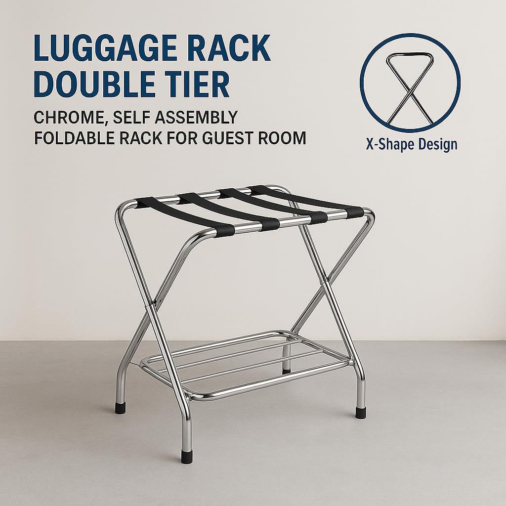 Luggage Rack double tier for Guest Room ,Chrome, Foldable Suitcase Stand with Straps,self assemble – Heavy Duty Luggage Stand for Bedroom, Hotel, or Closet Storage(Pack of 1)