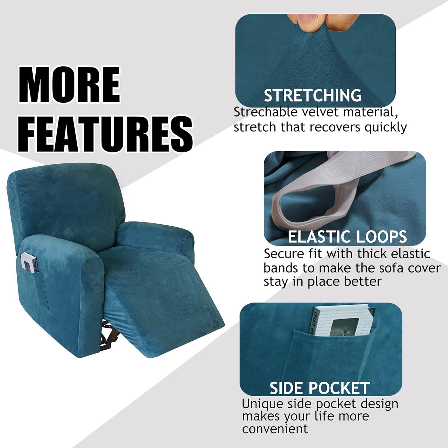 This Cozy and Soft Velvet Furniture Slipcover can not only protects your recliner from daily wears and tears, stains, kids, scratches from pet claws or accidental spills, but it can also transform an old, worn out couch into the new stunning centerpiece of your room. Our recliner slipcovers also help you update your décor, chamger colors and texture when you like and avoid you the costly investment of a new furniture. Why Choose Our Recliner Cover Our recliner cover has a good wear resistance and fully protects your furniture, greatly prolong the service life of the recliner. If your recliner is partially broken, now use our slipcover to prevent the recliner from wear and tear. High Features for Our Velvet Recliner Cover: ·Ultra thick and soft velvet fabric makes our sofa covers more stretchy and durable, rich and comfortable ·Compared to one piece, 4-PIECE design will perfect fit your furniture better, definitely like customized, makes your furniture a brand new look ·Easy to put on and off, the elastic loops will keep your slipcover from slipping and wrap your recliner better ·A must-have for homes with children and pets. Having a recliner cover will protect your furniture from daily wear and tear ·With a brief style and appealing colors, these slipcovers are suitable for various styles of furniture and decoration, make your old furniture appear brand new How to Install 1.Find the CENTER BACK OF COVER label. Stand behind the recliner and drape it over the upper back of the recliner. Attach elastic straps to the hooks located at the bottom of recliner. 2.Using the cover with label LEFT ARM cover the corresponding arm of the recliner. 3.Using the cover with label RIGHT ARM cover the corresponding arm of the recliner. 4.Find the CENTER FRONT OF COVER label. Drape it on the footrest. Tying the elastic straps together under the footrest.