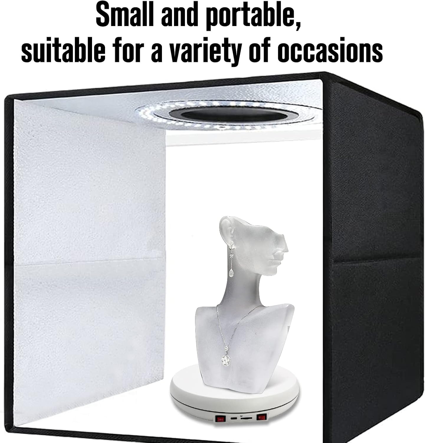 360 Degree Steady Rotation The turntable 360 degree rotation in omnidirectional to catch most eyesight on a table, counter, shelf, rack, shopwindow. showing the product in any angle, Available rotation in clockwise direction or CCW direction, just press the ON/OFF switch to change rotation direction. Use very convenience, functions multiple. Rotation with Light Illumination The ultra bright led light up illuminate at dark site, works on your night & dark promotion campaign, activity, party, foil atmosphere. Rotation & Light ON or Rotation & Light OFF are available, just press the switcher. So easy to get your expecting effect. More Loading Capacity Up to 55 pounds centric loading capacity, low noisy ,stable rotation ,Modern design, easy to use, multi-function, excellent effect, durable in use, ideal for product display in exhibition or shop. Product description : item size:10inch/25cm Net Weight: 0.6 kg / 1.3 lbs Maximum Load: 55 lbs (25 Kg) Material: ABS+Motor+PCBA Package Include: 10inch Turntable * 1 pcs User Manual * 1 pcs USB cable * 1pcs