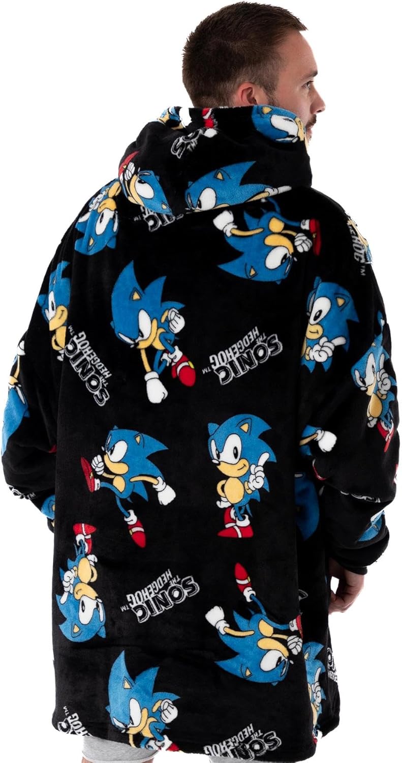 Experience ultimate comfort and adventure with the Sonic The Hedgehog Men's Black Blanket Hoodie. This hooded sweatshirt, made of 100% polyester fleece, is super soft on the outside and fully lined with cozy Sherpa fleece on the inside. The kangaroo pocket provides extra warmth and storage. With a one-size-fits-most design, it's perfect for male adults who prefer a loose fit. The hoodie is machine washable for easy care. Embark on a journey of comfort and relaxation, and unleash your inner Sonic with every wear. This product, exclusive to Vanilla Underground, is ideal for daily wear, especially during spring, autumn, and winter. The Men's Black Blanket Hoodie is a must-have for fans of Sonic The Hedgehog and video games.