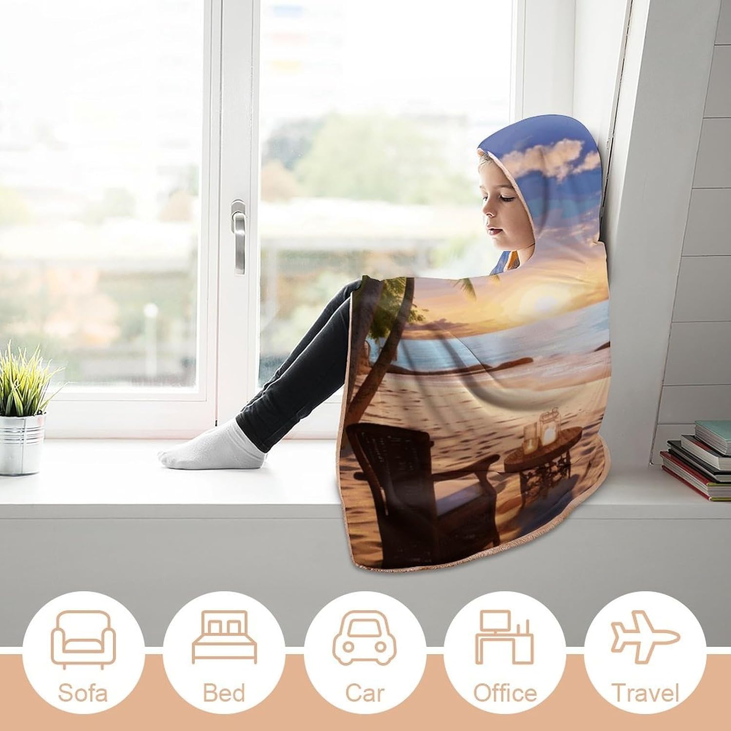 Wrap yourself in luxury with our Wearable Hooded Blanket!PREMIUM MATERIAL:Crafted from premium arctic velvet, this reversible blanket combines ultra-softness with durability. The smooth, non-shedding surface and flesh-pink interior feel gentle against your skin, while the breathable fabric ensures comfort without overheating.PRACTICAL BLANKET:Designed for convenience, the attached hood stays secure without dragging, making it easy to move around while staying cozy. Whether you're reading on the sofa, camping outdoors, gaming with friends, or napping, this wearable cloak blankets you in warmth wherever you go.DURABLE & SKIN-FRIENDLY:Meticulously stitched with vibrant colors, this Romantic Beach blanket retains softness and shape after washing. No bleach required. Designed for everyday use.EXQUISITE WORKMANSHIP:Delicate stitching, high-definition printing and dyeing, clear patterns, bright colors, no fading, many choices, it is warm and beautiful when worn on the body.WARM GIFT:This super soft cloak blanket is specially designed for intimate love, loved ones, friends gift for Christmas Thanksgiving gifts, beautiful and soft blanket is to bring them warmth, joy and love feeling.EASY MAINTENANCE:Machine washable (cold water) for hassle-free cleaning, it retains its vibrant color and plush texture wash after wash. Embrace versatility and comfort.Size:40 inches x 50 inches / 100cm x 130cm50 inches x 60 inches / 130cm x 150cm60 inches x 80 inches / 150cm x 200cmI wish you a pleasant shopping experience!
