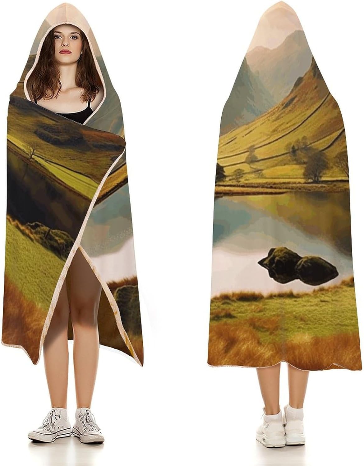 Wrap yourself in luxury with our Wearable Hooded Blanket!PREMIUM MATERIAL:Crafted from premium arctic velvet, this reversible blanket combines ultra-softness with durability. The smooth, non-shedding surface and flesh-pink interior feel gentle against your skin, while the breathable fabric ensures comfort without overheating.PRACTICAL BLANKET:Designed for convenience, the attached hood stays secure without dragging, making it easy to move around while staying cozy. Whether you're reading on the sofa, camping outdoors, gaming with friends, or napping, this wearable cloak blankets you in warmth wherever you go.DURABLE & SKIN-FRIENDLY:Meticulously stitched with vibrant colors, this Lake District National Park blanket retains softness and shape after washing. No bleach required. Designed for everyday use.EXQUISITE WORKMANSHIP:Delicate stitching, high-definition printing and dyeing, clear patterns, bright colors, no fading, many choices, it is warm and beautiful when worn on the body.WARM GIFT:This super soft cloak blanket is specially designed for intimate love, loved ones, friends gift for Christmas Thanksgiving gifts, beautiful and soft blanket is to bring them warmth, joy and love feeling.EASY MAINTENANCE:Machine washable (cold water) for hassle-free cleaning, it retains its vibrant color and plush texture wash after wash. Embrace versatility and comfort.Size:40 inches x 50 inches / 100cm x 130cm50 inches x 60 inches / 130cm x 150cm60 inches x 80 inches / 150cm x 200cmI wish you a pleasant shopping experience!
