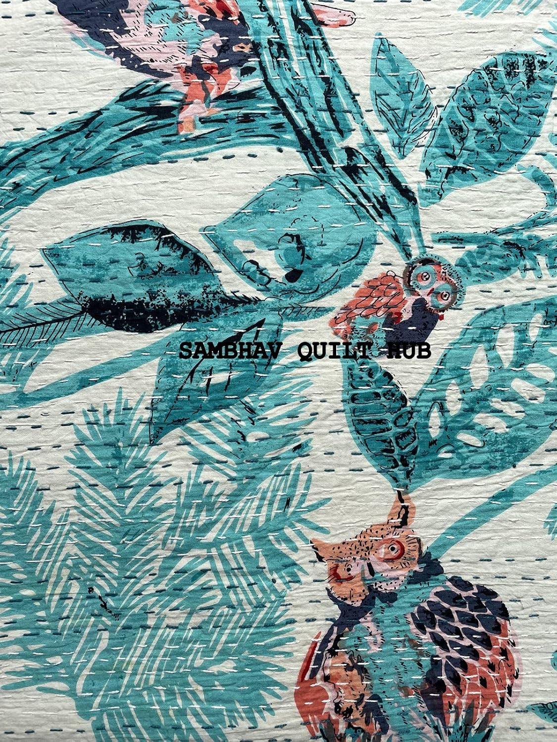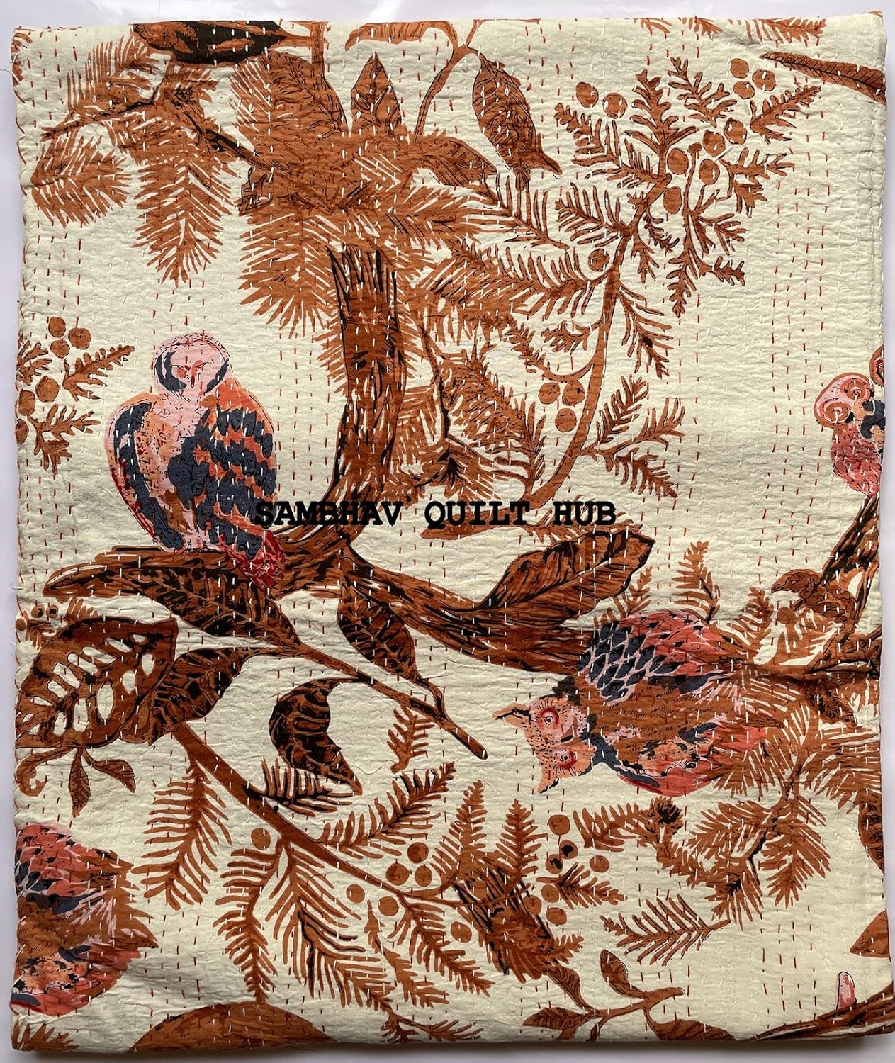 This Hand blocked print design Queen size Kantha quilt is hand made & 100% cotton. Each of these unique & beautiful quilt takes approx 7-10 days to make. This is hand made & hand dyed unique Handmade & Queen Size Kantha Quilt is symbolic of Indian heritage. This piece is Made by Original Indian kantha work Artisan. This piece of art is fully reversible & made using 100% cotton. This has different & random combination of colours & pattern which is making it more unique. Handcrafted in Rajasthan rural village bikaner its located in India & Pakistan border area. Can be used as: 1. Quilt 2. Bed spread 3. blanket 4. Bed cover 5. You can be creative: Lot of people are using this in curtains, making begs etc. Size : Queen size - 90 x 108 Inches/ King Size 108X108 inches /60X90 inches