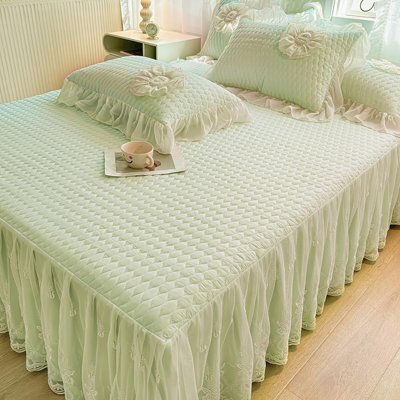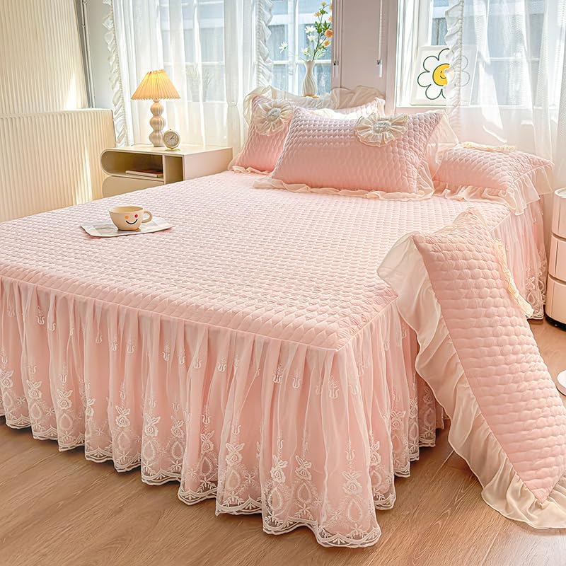 The bedspread perfectly combines the classical aesthetics and modern fashion, it is a sophisticated bedroom decoration. Two layers ruffle skirt creates flowy touch and makes your bedroom peaceful and serene, alive and vibrant. The vintage lace ruffle not only fits for light luxurious style, but also is good for country style and farmhouse.The top plate is filled with synthetic cotton, it is lightweight and breathable, the outside fabric is washable cotton, which is ultra soft and cozy, the bed spread will provides intensive care for your skin.As a multi-functional bedding collection, the bedspread is avaialbe for all seasons. In winter, it is a warm bed sheet, the quilted design with high quality filling makes you feel warm in a few second when you lie down. This character is very important for seniors and kids. In summer, it is a very comfortable and lightweight blanket. In spring and fall, as a bed coverlet, it will highlight your room and keep your bed clean and tidy.Size Information:Queen Size: 1 bedspread with 59" wide x 78" long x 18" drop (150 x 200 x 45 cm).King Size: 1 bedspread with 78" wide x 86" long x 18" drop (200 x 220 x 45 cm).California King Size: 1 bedspread with 70" wide x 78" long x 18" drop (180 x 200 x 45 cm).How to choose the Size?Step 1: Measure the width of your bed and height from bed to floor, calcuate the expected total width of bedspread = bed width + 2 x bed height.Step 2: Refer to the total width of our bedspreads below:The total width of Queen Size is 94" (240 cm).The total width of King Size is 114" (290 cm).The total width of California King Size is 106" (270 cm).Step 3: Choose the suitable size of our bedspread. Please Note: if you have a high bed, please choose a large size to make the bedspread drape to the floor.