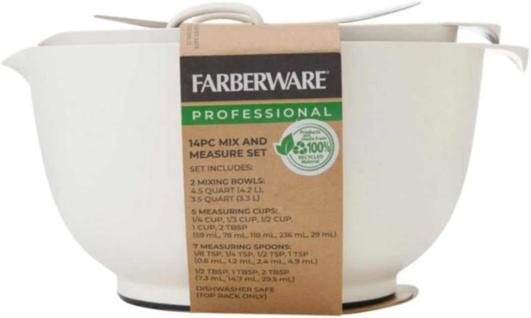 Elevate your baking game with this 14-piece recycled plastic baking set. Designed for home bakers and kitchen enthusiasts, it includes all the essentials — from measuring cups to a sturdy mixing bowl. Lightweight, durable, and eco-friendly, this beige-toned set brings practical style and sustainable function to your everyday kitchen prep.