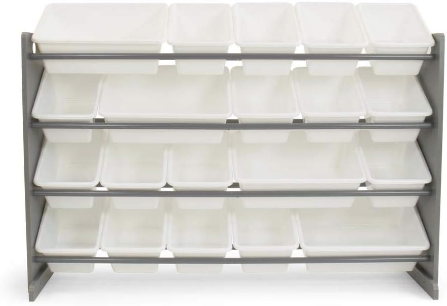 Upgrade your home organization with the Humble Crew Extra-Large 20-Bin Toy Organizer, the perfect solution for families needing more space and style. Offering 40% more storage than standard toy organizers, this four-tier unit features 16 standard bins and 4 large bins (equivalent to 8 standard bins) to handle everything from toys and books to art supplies and accessories. Crafted with a sturdy engineered wood frame, reinforced steel rods, and safety-enhancing stabilizing braces and anti-tip straps, this organizer is built to handle the hustle and bustle of daily play. Each level can support up to 20 pounds, ensuring long-lasting reliability. The removable plastic bins are easy for kids to use independently—fostering responsibility while keeping spaces neat. Measuring 51"W x 11"D (16"D with stabilizing braces) x 32"H, this versatile storage rack is ideal for nurseries, bedrooms, classrooms, mudrooms, or even home offices. Finished in a clean grey and white colorway, this unit complements any modern décor and grows with your family’s needs. Easy to assemble with all hardware included, the Humble Crew Extra-Large Organizer transforms chaos into calm in any room.