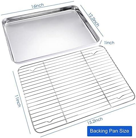 LKOP Feature: -Premium quality: Made of top quality stainless steel which is heavy duty. It is to use with a smooth edge to avoid any scartch. -Easy to clean : 100% Dishwasher -Non bending & deforming -Widely use: Classic half sheet pan and cooling rack for baking cookies cakes, chicken, steak, turkey, and roasting vegetables; both are oven up to 450 degrees Fahrenheit. Specification : Size: Big: Cooling Rack:38.5*28 , Baking Sheet:40.5*31*2.5cm Material: stainless steel Color: Silver Weight: Big: 2099g/74.04oz/4.63lb Package included: Cooling Rack*2 Baking Sheet*2