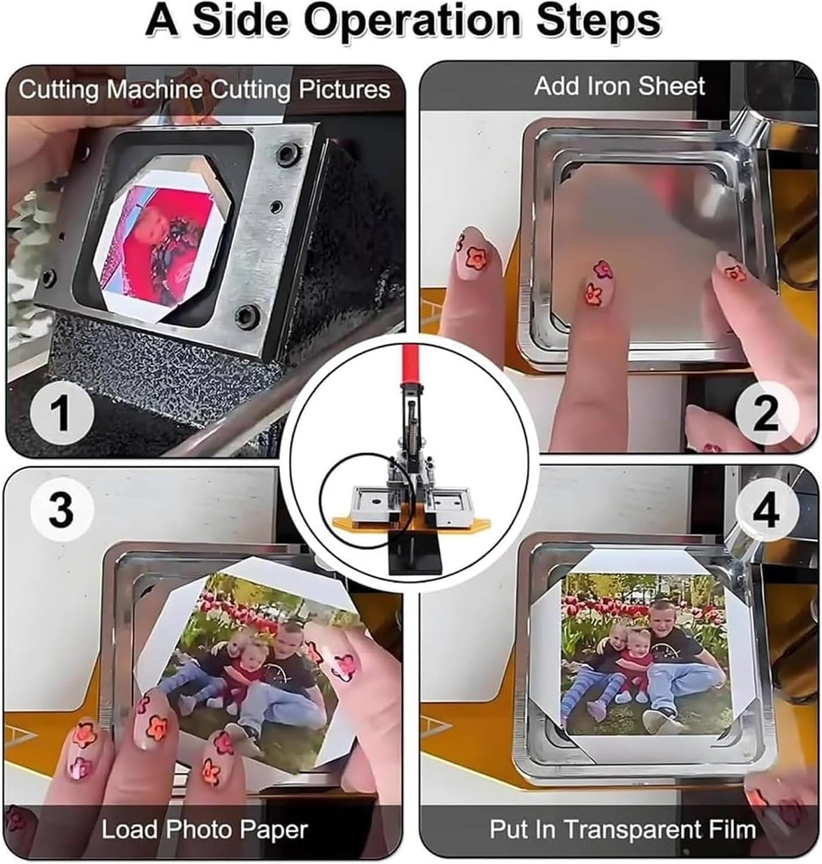 Photo magnet making machine is a device used to produce square photo magnets. Metal badge manufacturers specialize in the production and sale of various metal badges, including but not limited to commemorative medals, medals, school badges, work badges, etc.Specification:Product name:Button machineProduct material: Stainless steel,MagnetProduct size: 50x50mmWeight: 18kgProduct list:1 x Refrigerator magnet1 x Manual