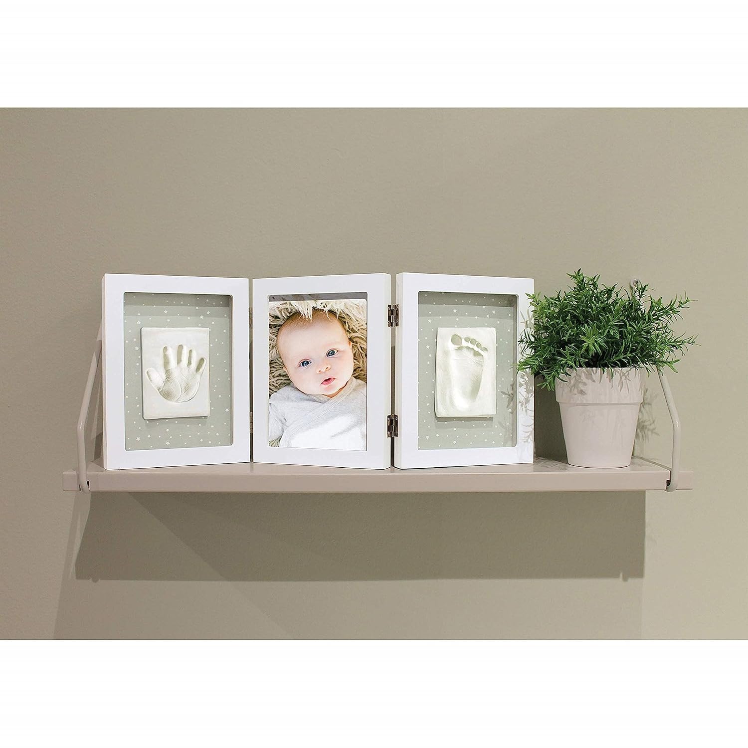 Product Description Xplorys Happy Hands Triple Frame White The Happy Hands Triple Frame Hand/Footprint Kit is the perfect way to capture a lasting impression of your baby's hand or foot print. Very Simple and Easy to use Kit - simply press the baby's hand or foot into the putty. Attractive White Wooden hinged Triplee Frame, each side hold a hand and/or footprint with a photo frame in the middle. Suitable for boys or girls Ideal Gift for Newborns or Christening Create a treasured keepsake. Set Contains: 1xHappy Hands Baby Print Triple Frame Kit