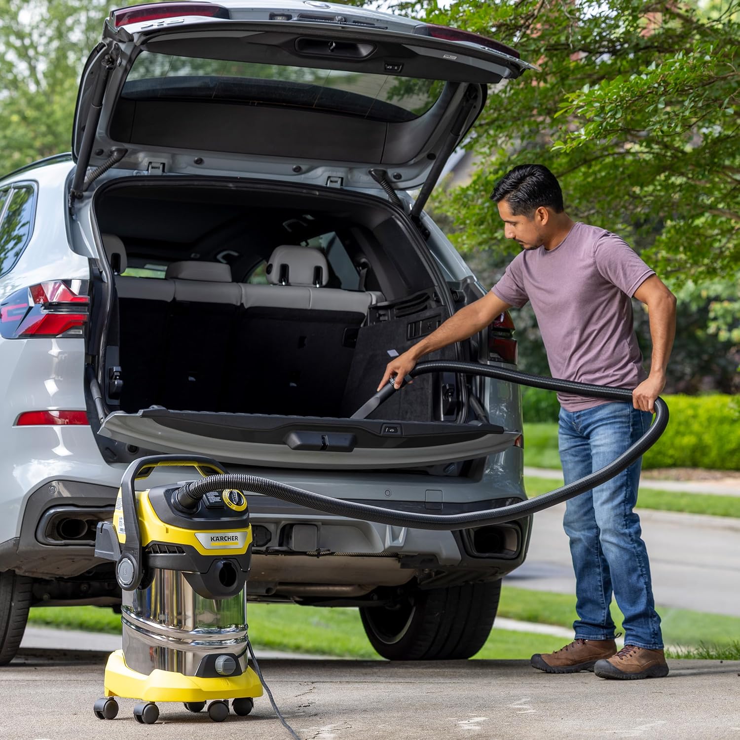 The Kärcher WD 5 P Wet/Dry Vacuum Cleaner is the perfect cleaning companion for powerful and convenient performance. With its advanced features and unrivaled filtration, this vacuum is designed to deliver maximum productivity and efficiency. Made in Europe with a robust construction, it ensures durability for years of reliable use. Featuring patented filter removal technology, the Kärcher WD 5 P allows for easy and hassle-free maintenance. There is no need to remove the filter when switching between wet and dry vacuuming, providing seamless cleaning for any task. The filter is conveniently housed overhead, ensuring sealed access without recirculating dust. Equipped with a built-in blower function, this vacuum quickly and effortlessly moves dirt and debris from those hard-to-reach areas. Say goodbye to stubborn messes. The 1100-watt motor delivers superior airflow into a generous 6.6 gallons (25L) of wet or dry capacity, providing ample space for all your cleaning needs. The Kärcher WD 5 P comes with a range of accessories to enhance your cleaning experience, including an 11.5 ft. (3.5m) suction hose, (2x) 1.8 ft. (0.5m) suction tubes, a hand nozzle, a crevice nozzle, a switchable wet/dry floor nozzle, an automotive-style pleated filter, a power tool adapter, and a fleece filter bag. It's a complete package designed to tackle various cleaning tasks with ease. With its small footprint, the Kärcher WD 5 P is designed for efficient storage, making it ideal for any space. Whether you need a shop vac, heavy-duty vacuum cleaner, or an outdoor vacuum for your patio, this versatile machine has got you covered. It's also a reliable choice for industrial use, garage cleaning, and even water vacuuming during flooding situations.
